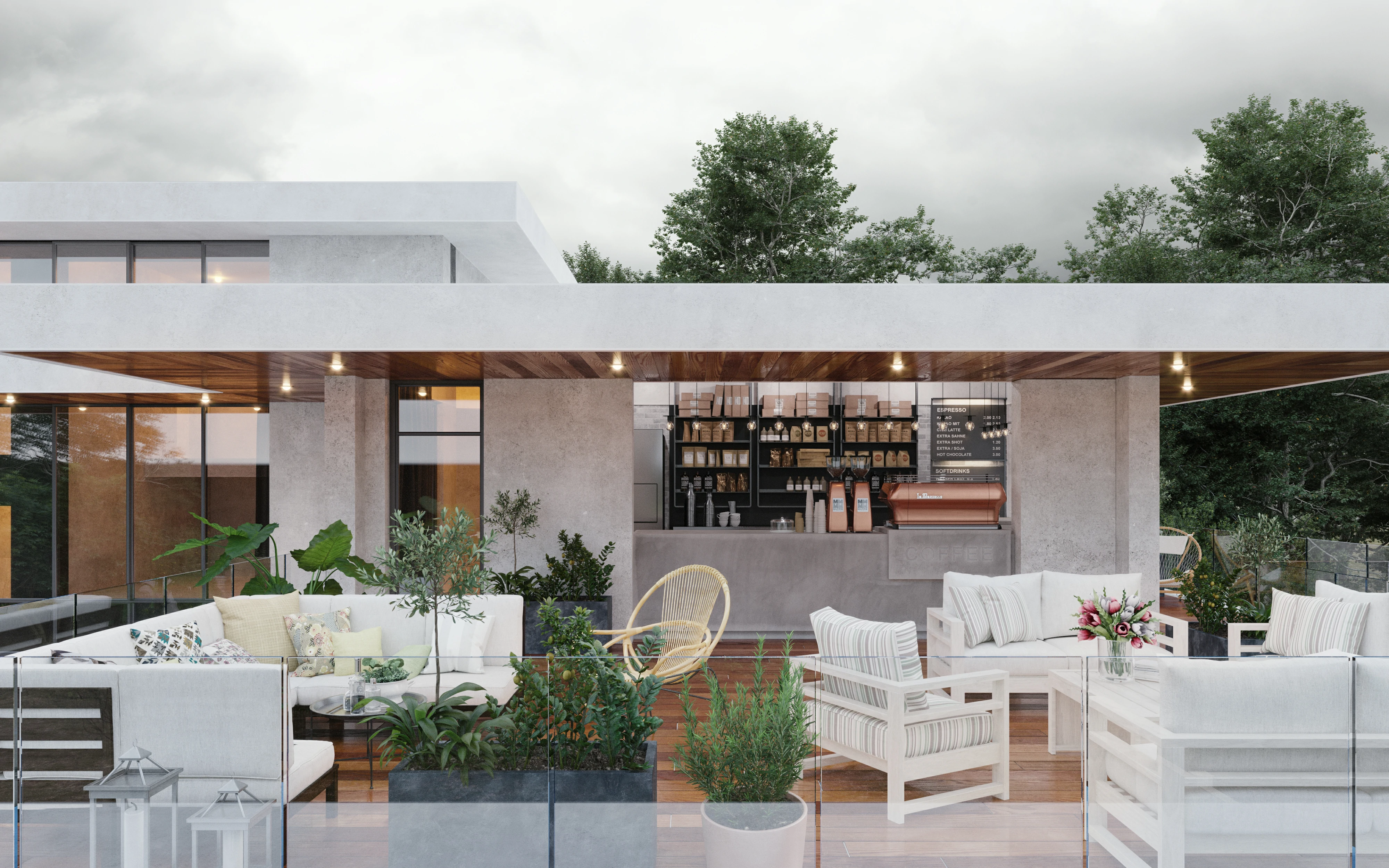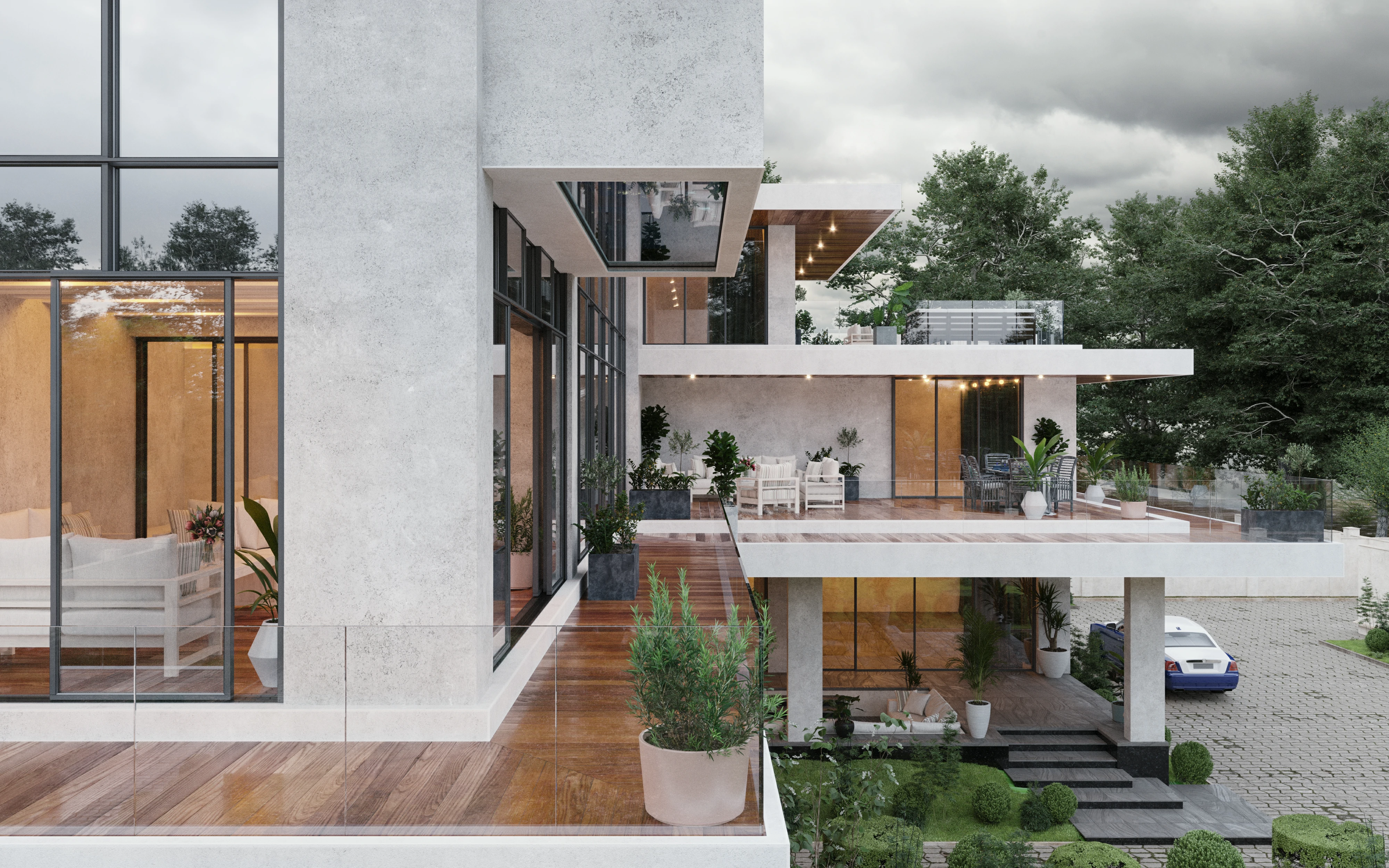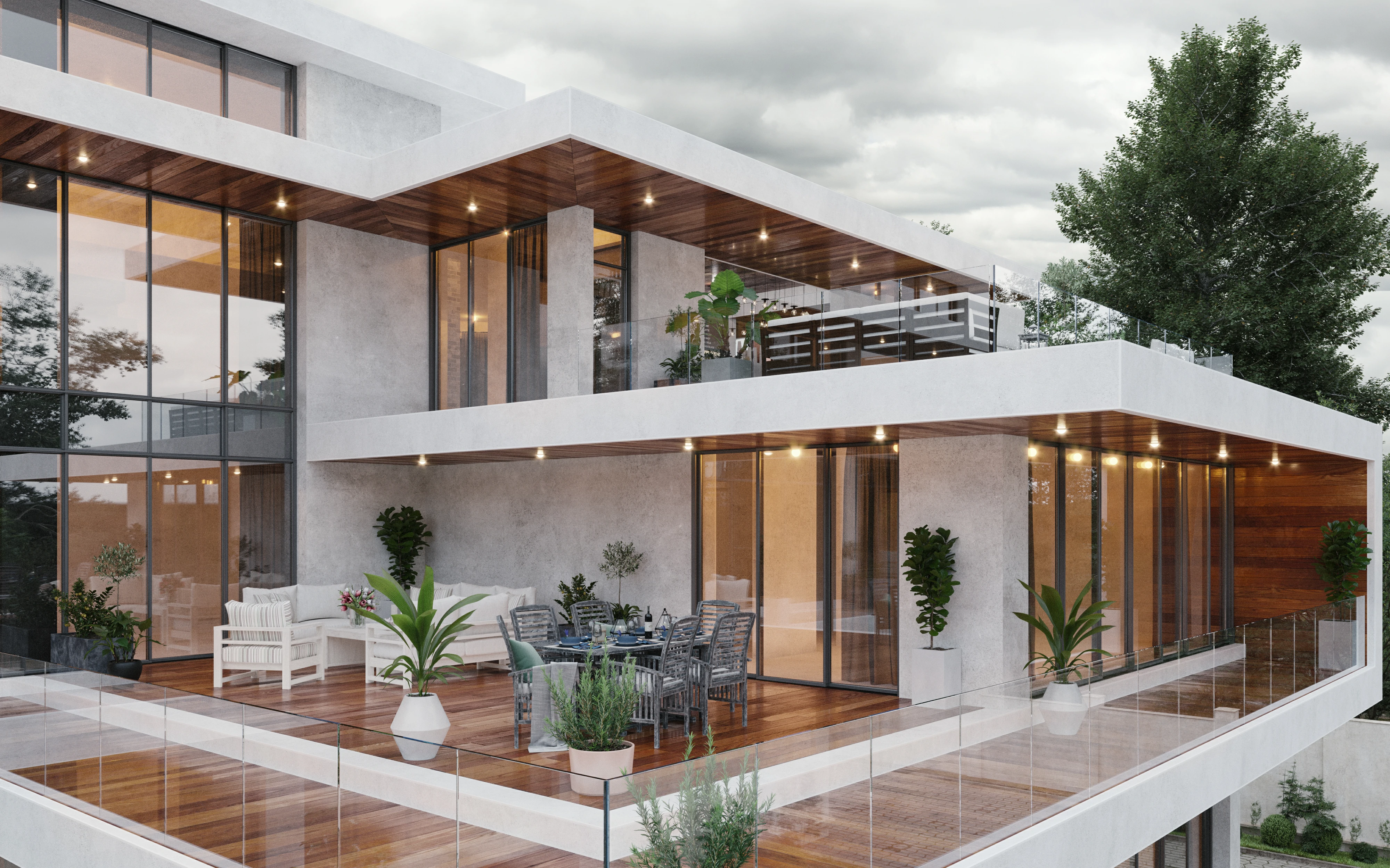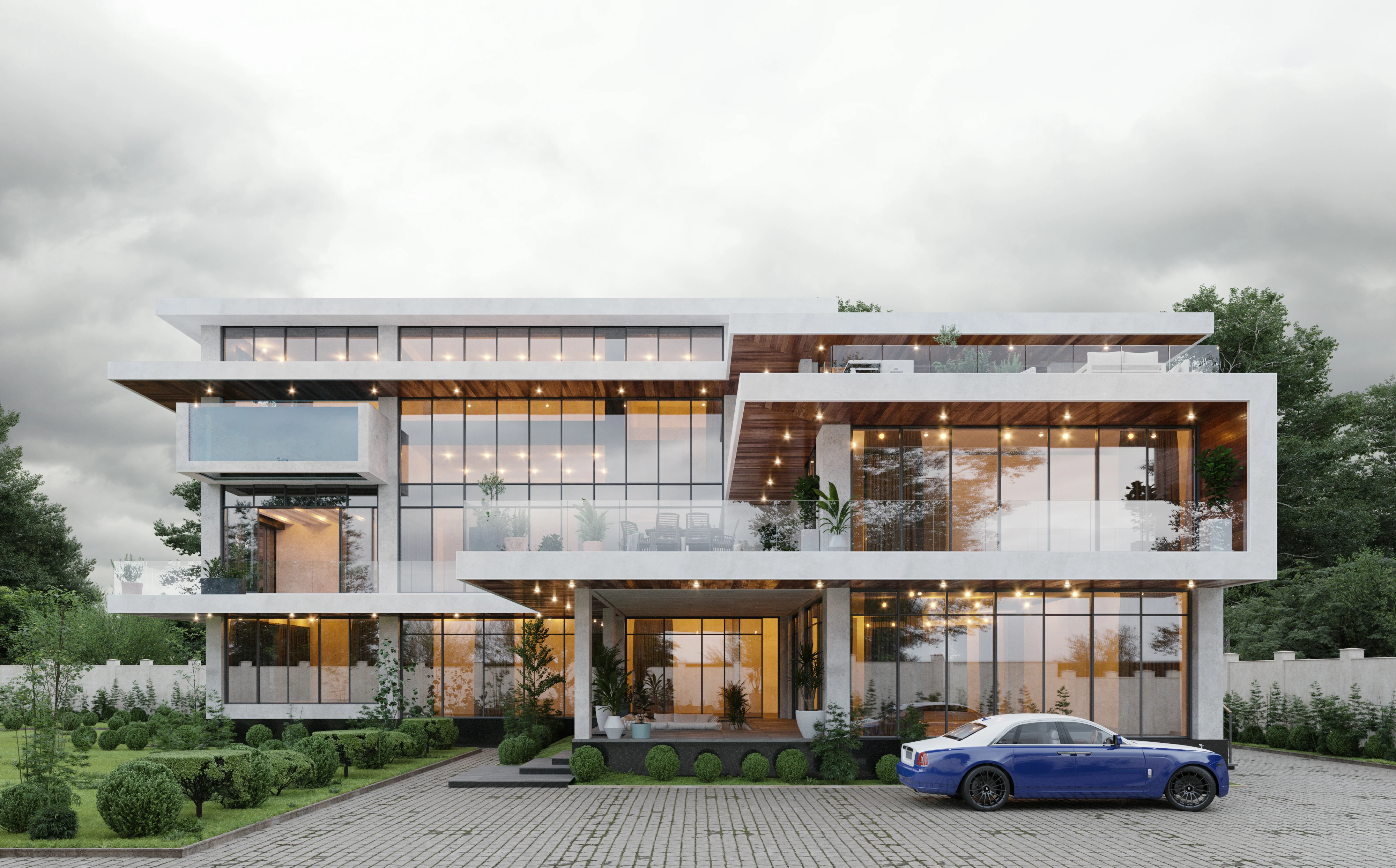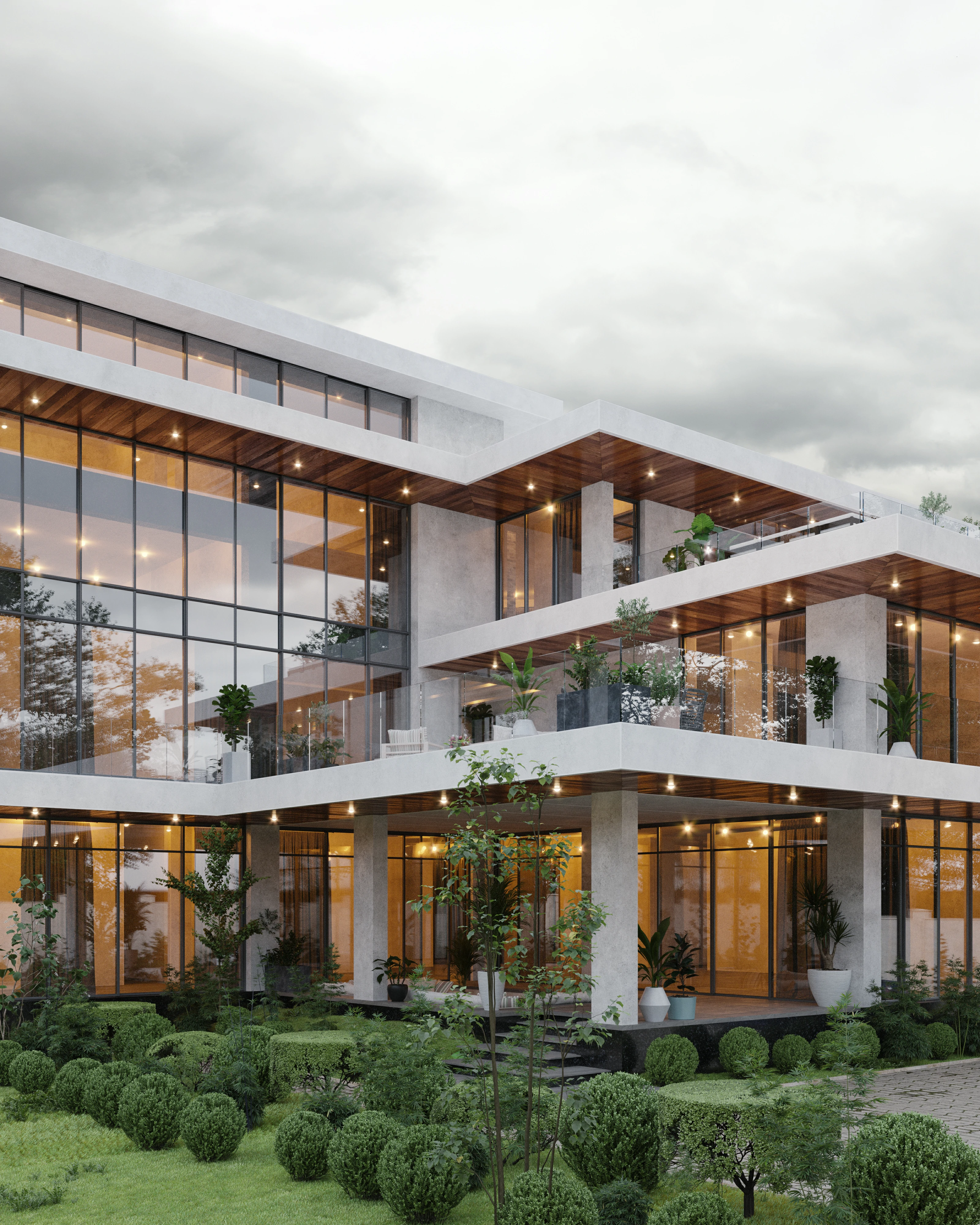 Это манифест динамичной современной архитектуры. Многослойные объёмы, обилие стекла и чёткая геометрия форм создают впечатление лёгкости и движения. Балконы, террасы и зелёные зоны интегрированы в структуру здания, формируя живое взаимодействие между интерьером и природой. Контраст холодного бетона и тёплого дерева придаёт дому характер и баланс. В вечернее время световая архитектура усиливает ощущение пространства и подчеркивает утончённость линий.