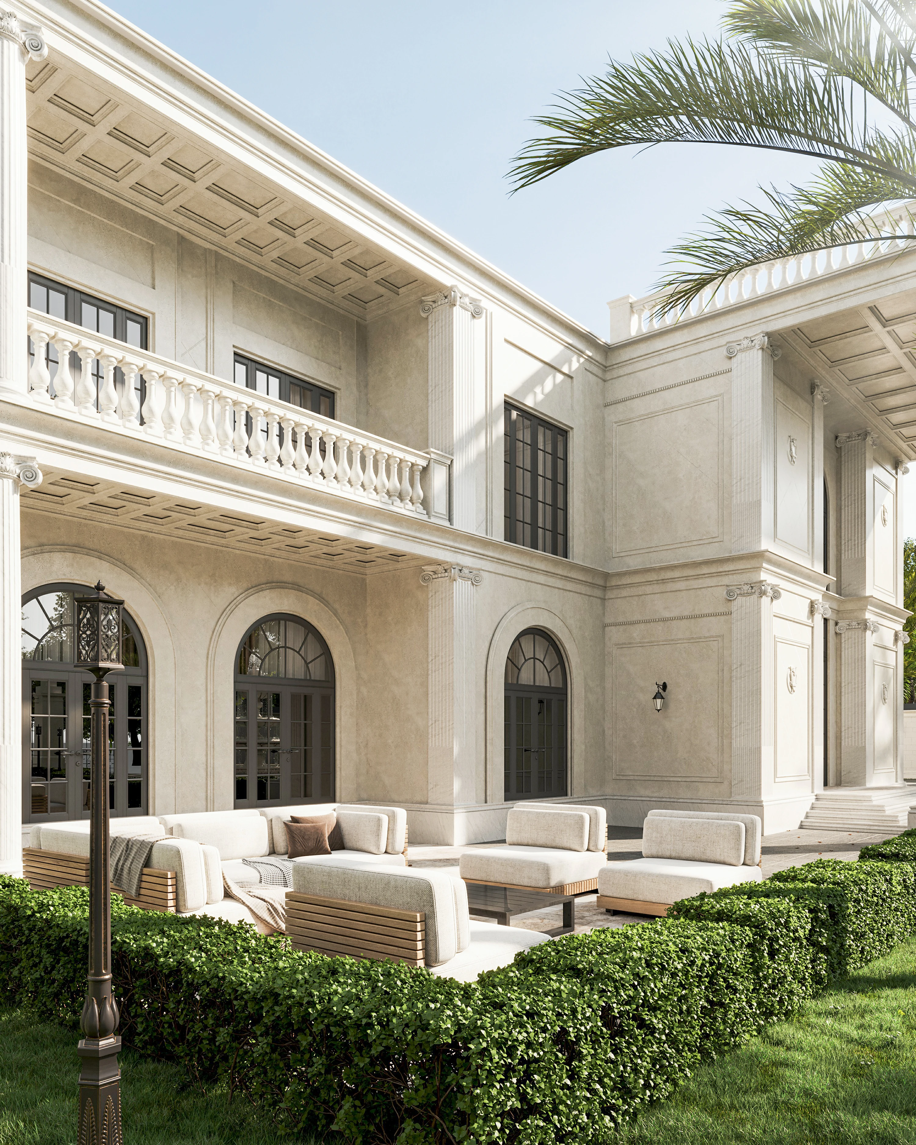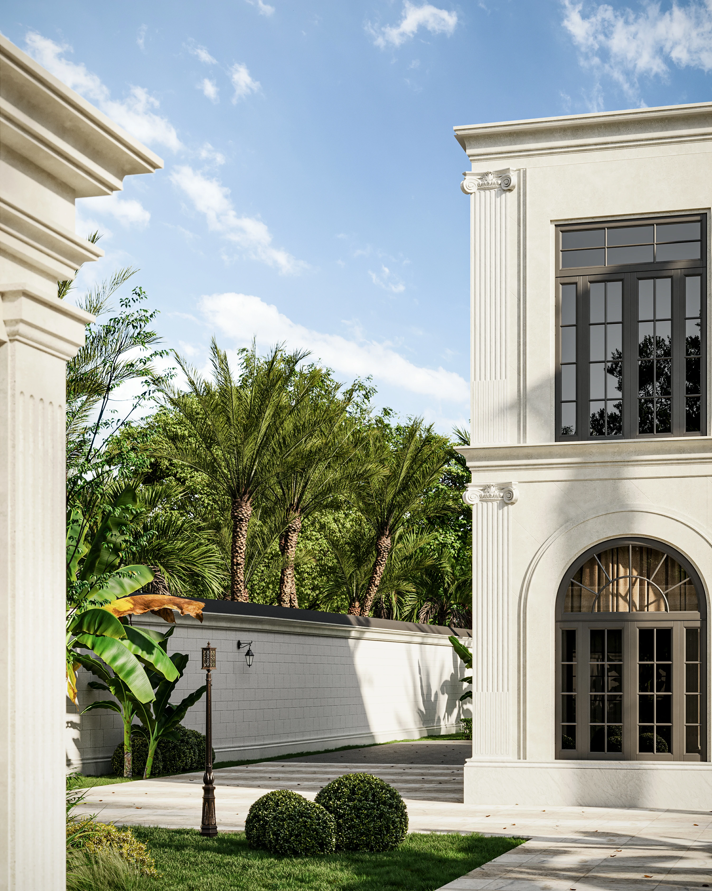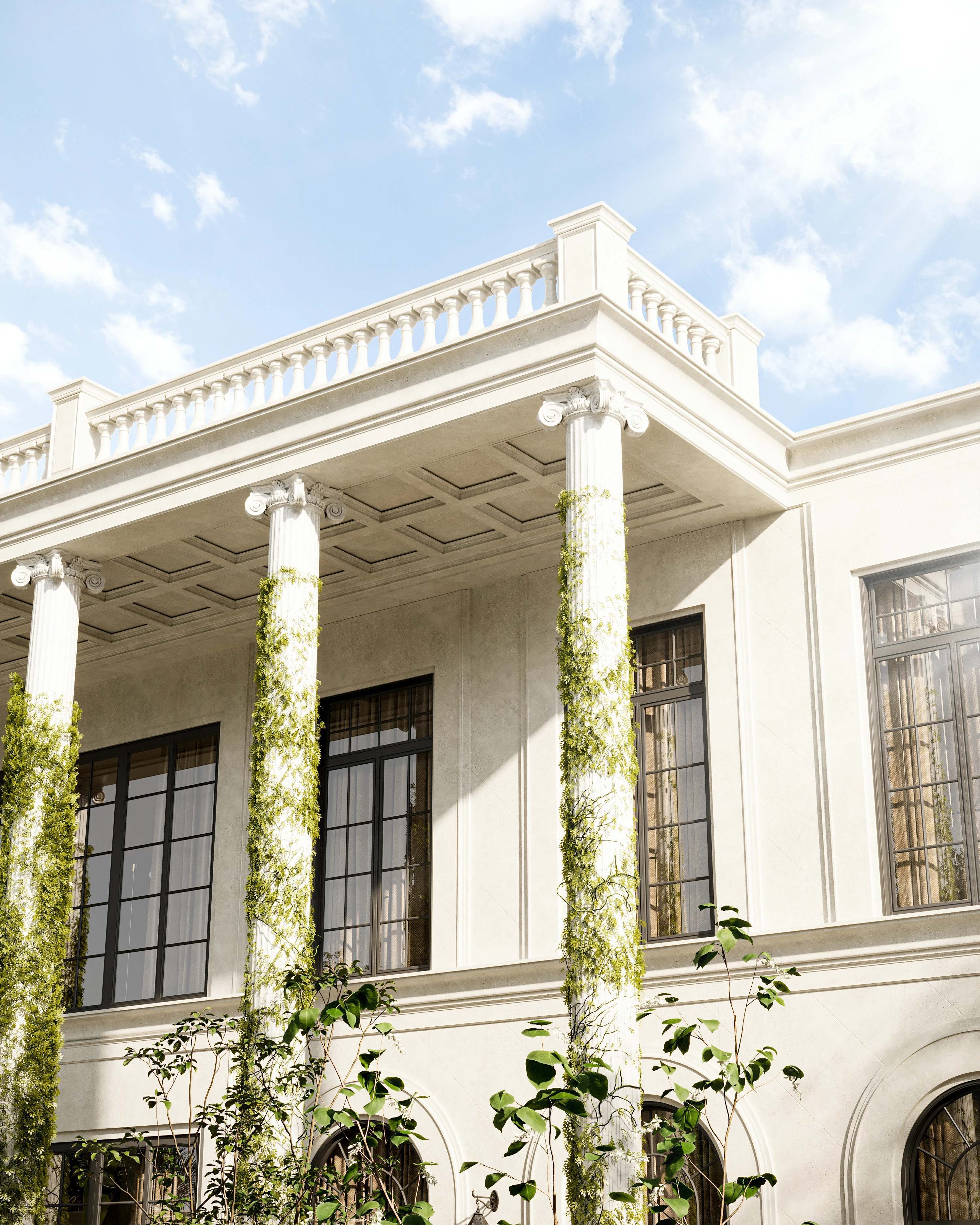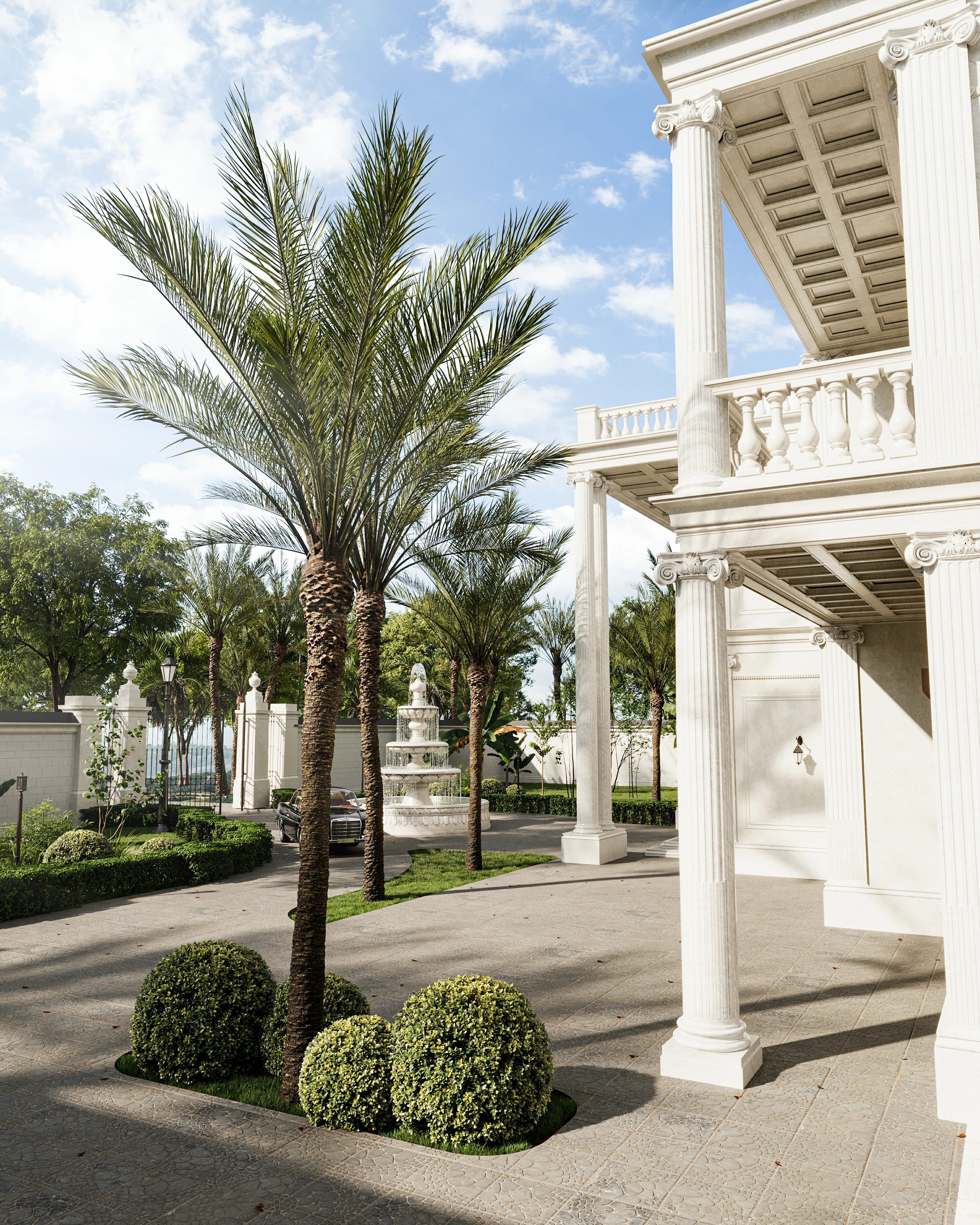 Воплощение изысканной роскоши и южного шарма. Архитектура дома вдохновлена классическими итальянскими виллами: величественные колонны, симметрия фасада, арочные окна и тёплая палитра создают атмосферу аристократической элегантности. Интерьер и экстерьер связаны через широкие террасы и выход к бассейну, где отражается свет дневного солнца. Вертикальное озеленение придаёт фасаду мягкость и живость, а природные материалы подчеркивают утончённый вкус владельцев.
