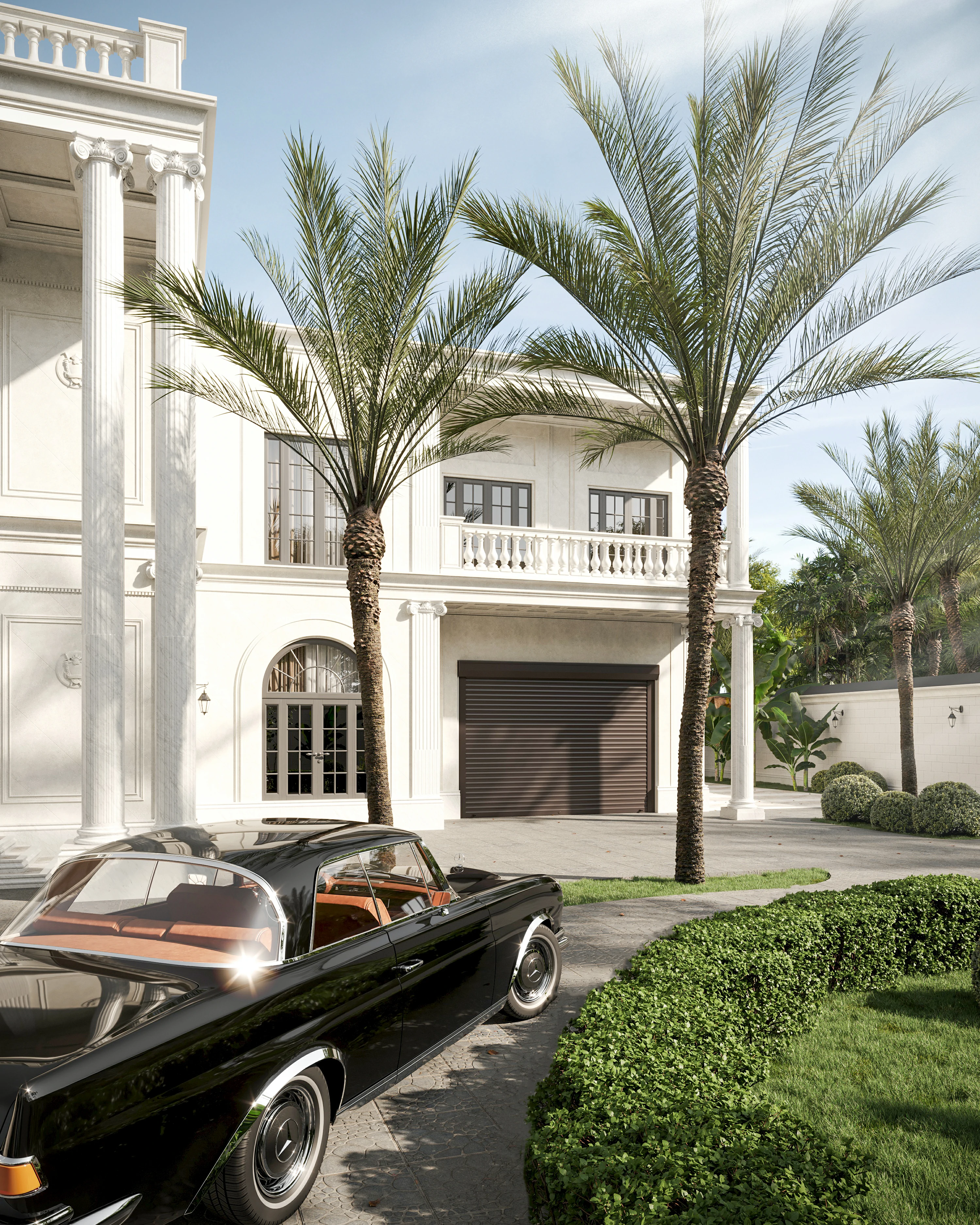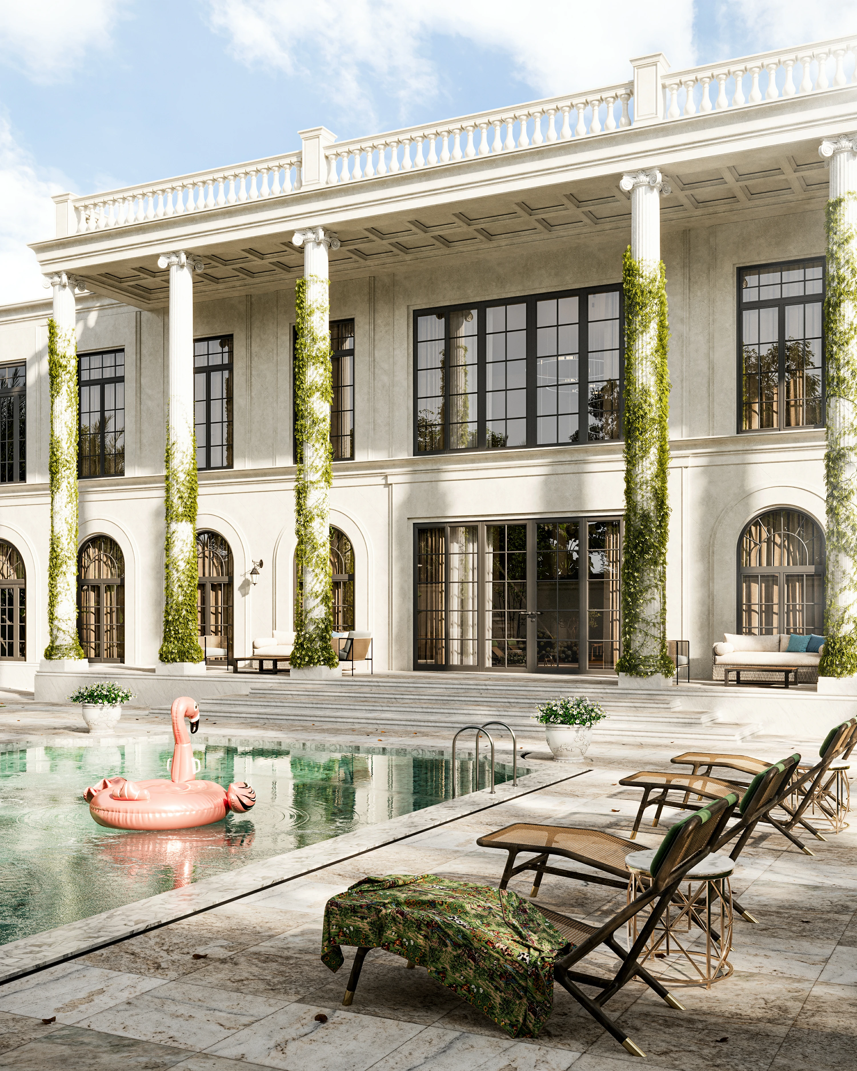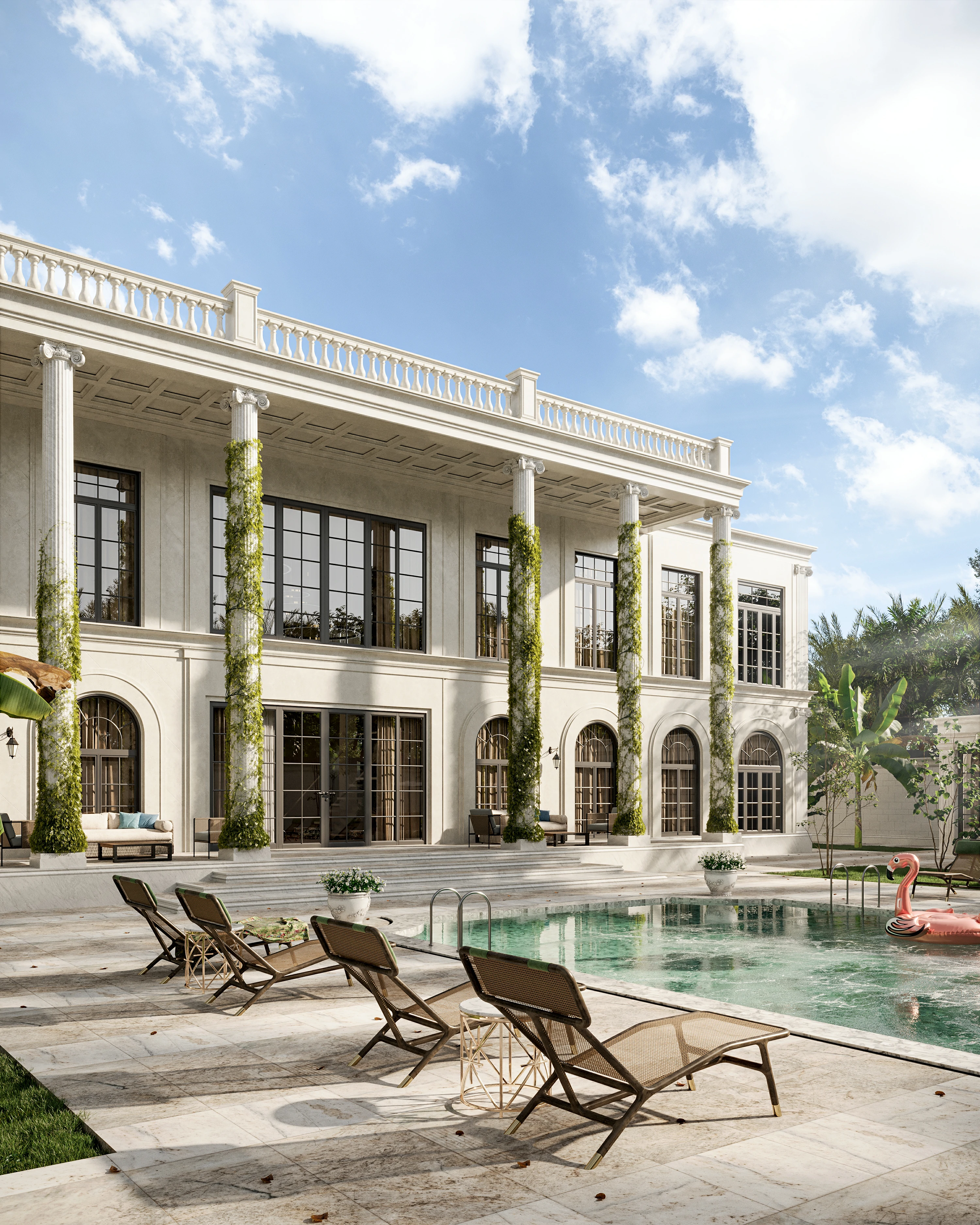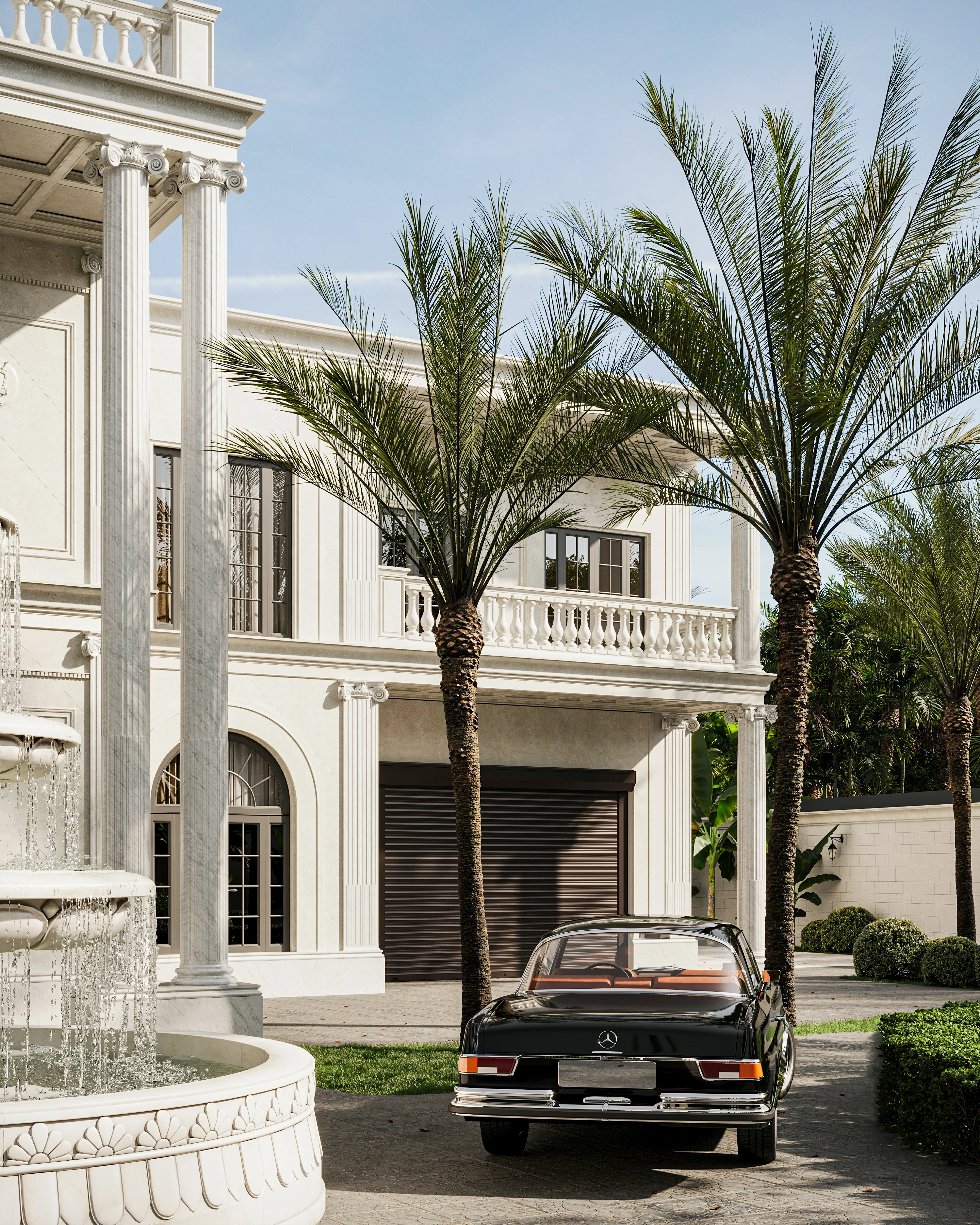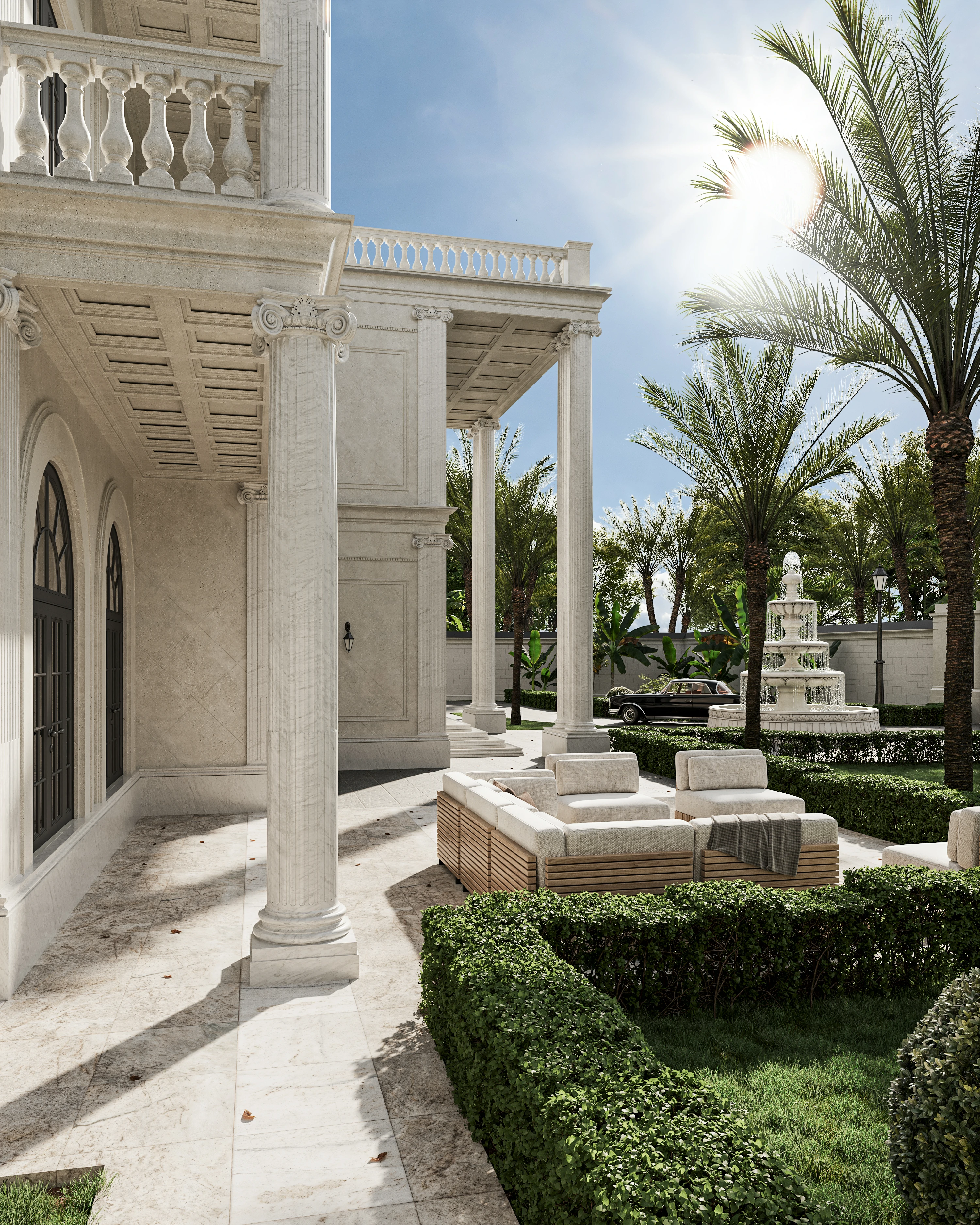 Воплощение изысканной роскоши и южного шарма. Архитектура дома вдохновлена классическими итальянскими виллами: величественные колонны, симметрия фасада, арочные окна и тёплая палитра создают атмосферу аристократической элегантности. Интерьер и экстерьер связаны через широкие террасы и выход к бассейну, где отражается свет дневного солнца. Вертикальное озеленение придаёт фасаду мягкость и живость, а природные материалы подчеркивают утончённый вкус владельцев.