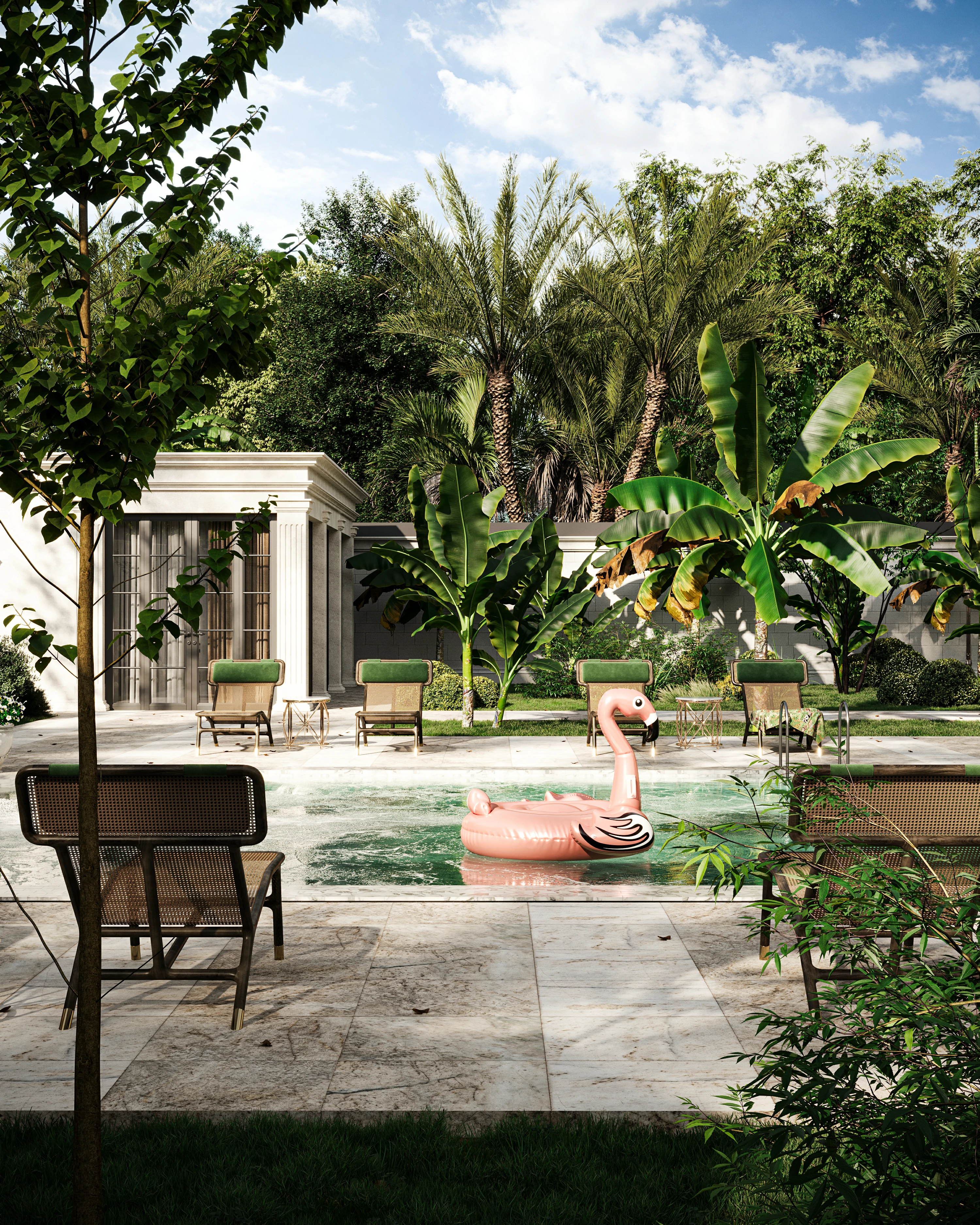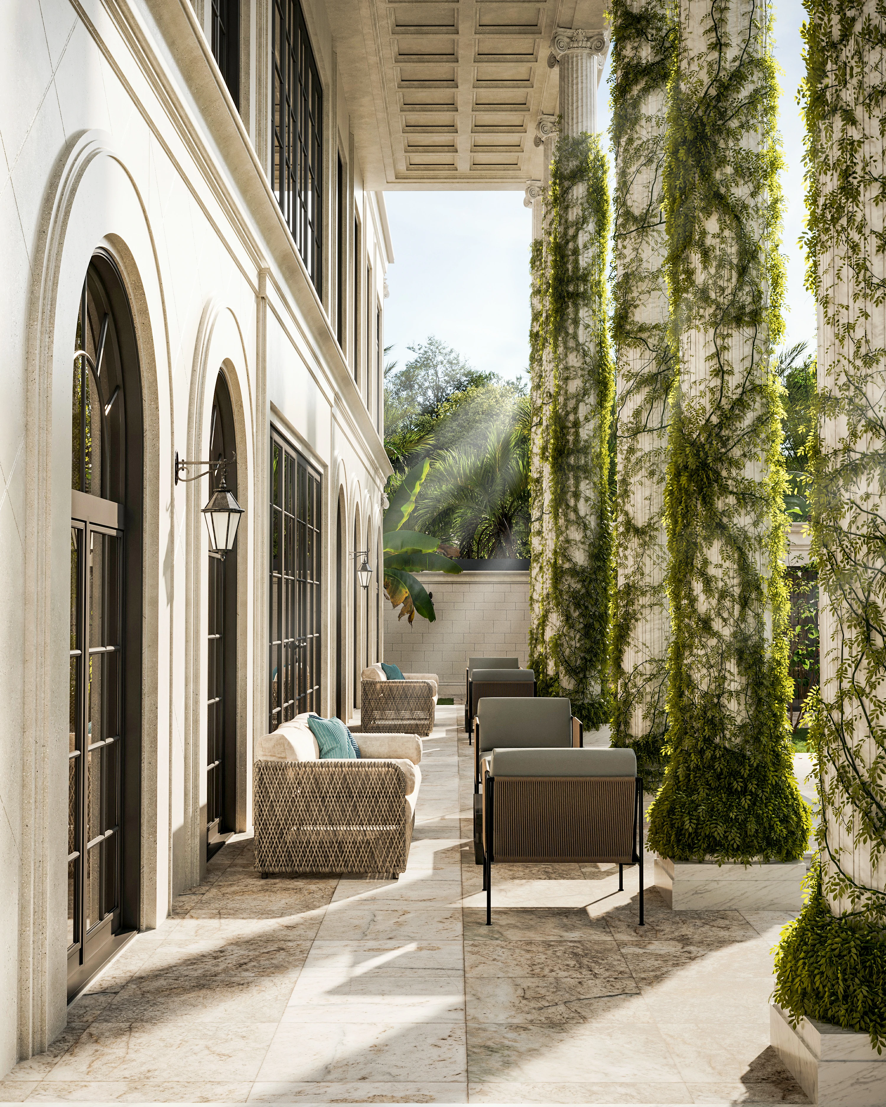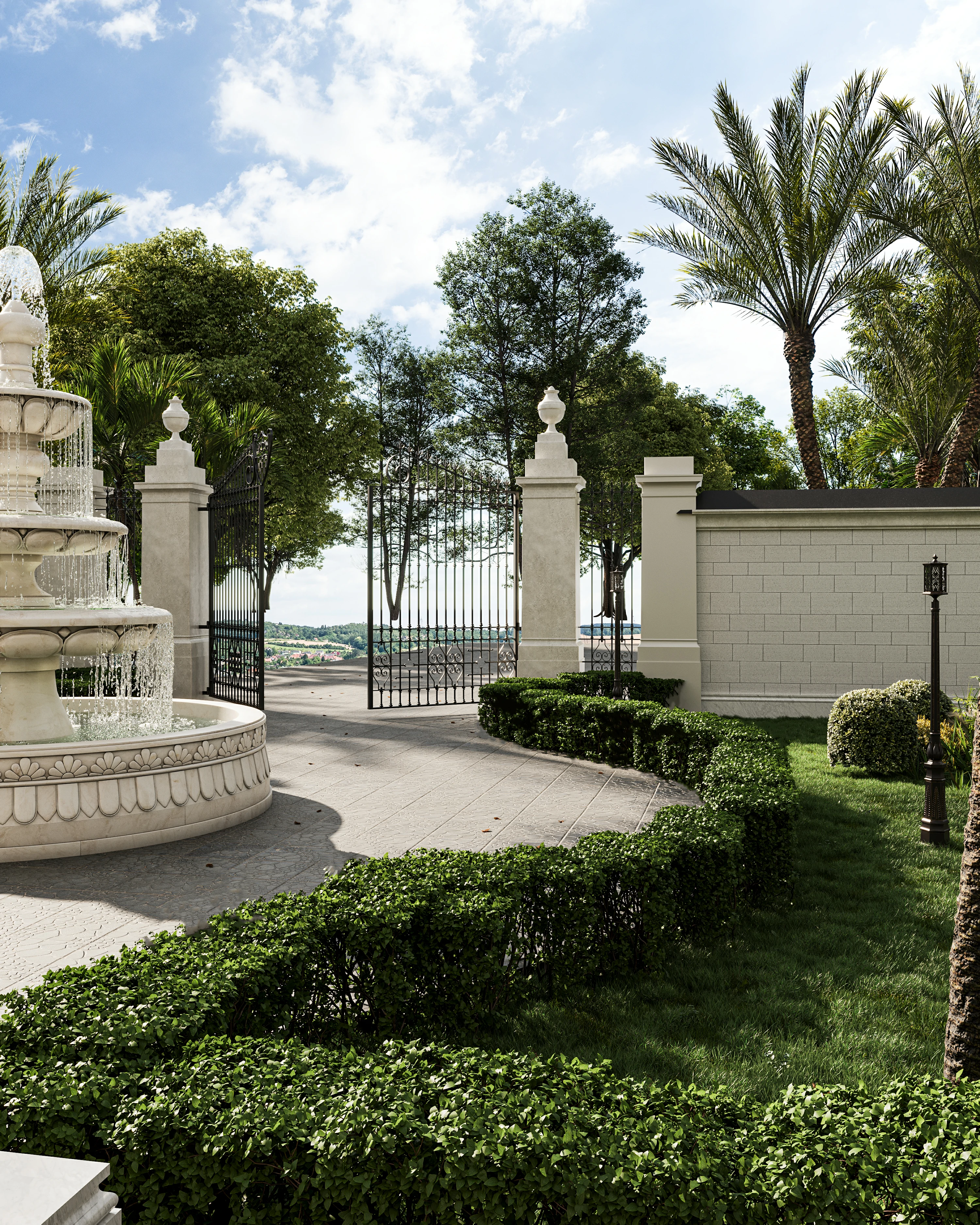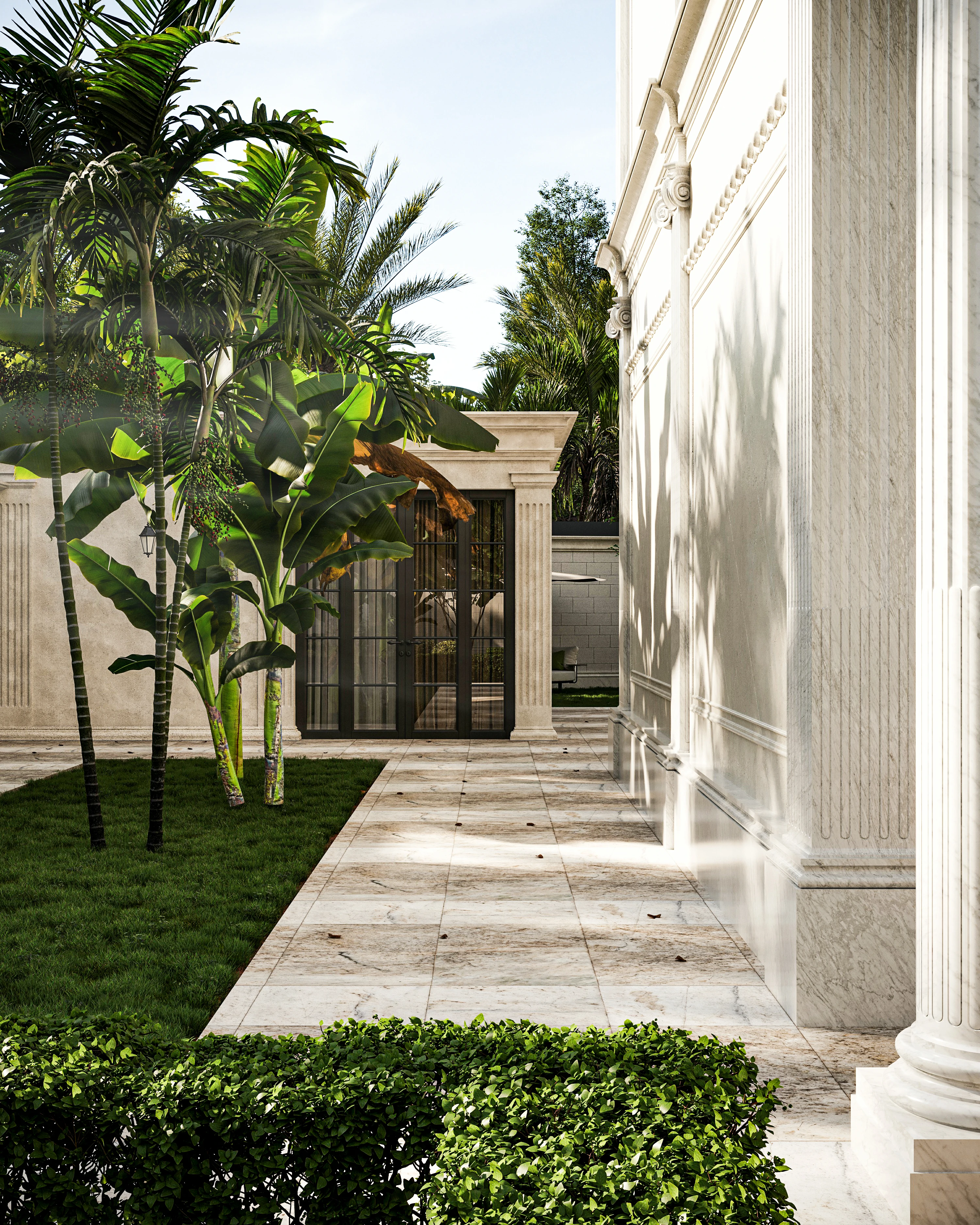 Воплощение изысканной роскоши и южного шарма. Архитектура дома вдохновлена классическими итальянскими виллами: величественные колонны, симметрия фасада, арочные окна и тёплая палитра создают атмосферу аристократической элегантности. Интерьер и экстерьер связаны через широкие террасы и выход к бассейну, где отражается свет дневного солнца. Вертикальное озеленение придаёт фасаду мягкость и живость, а природные материалы подчеркивают утончённый вкус владельцев.