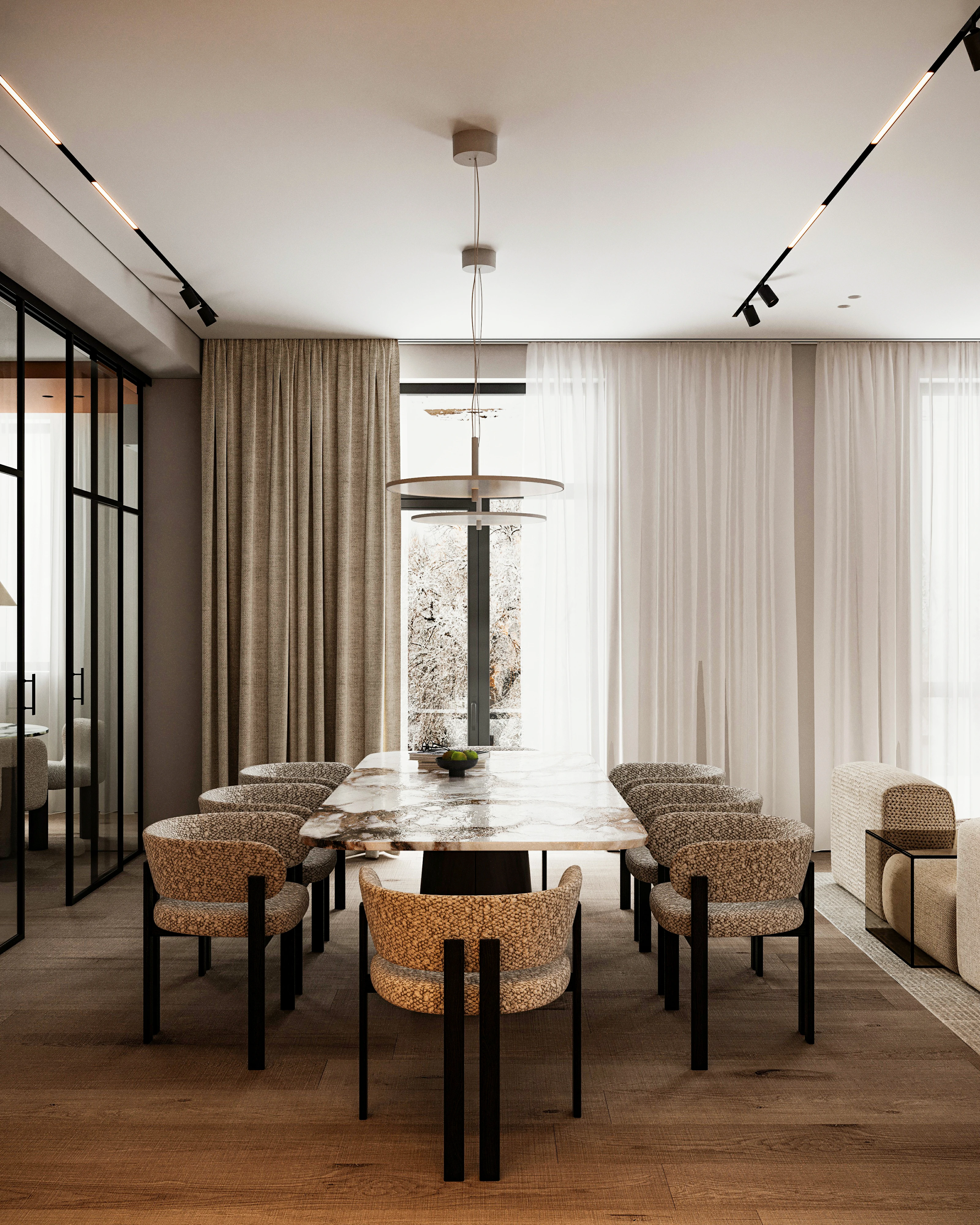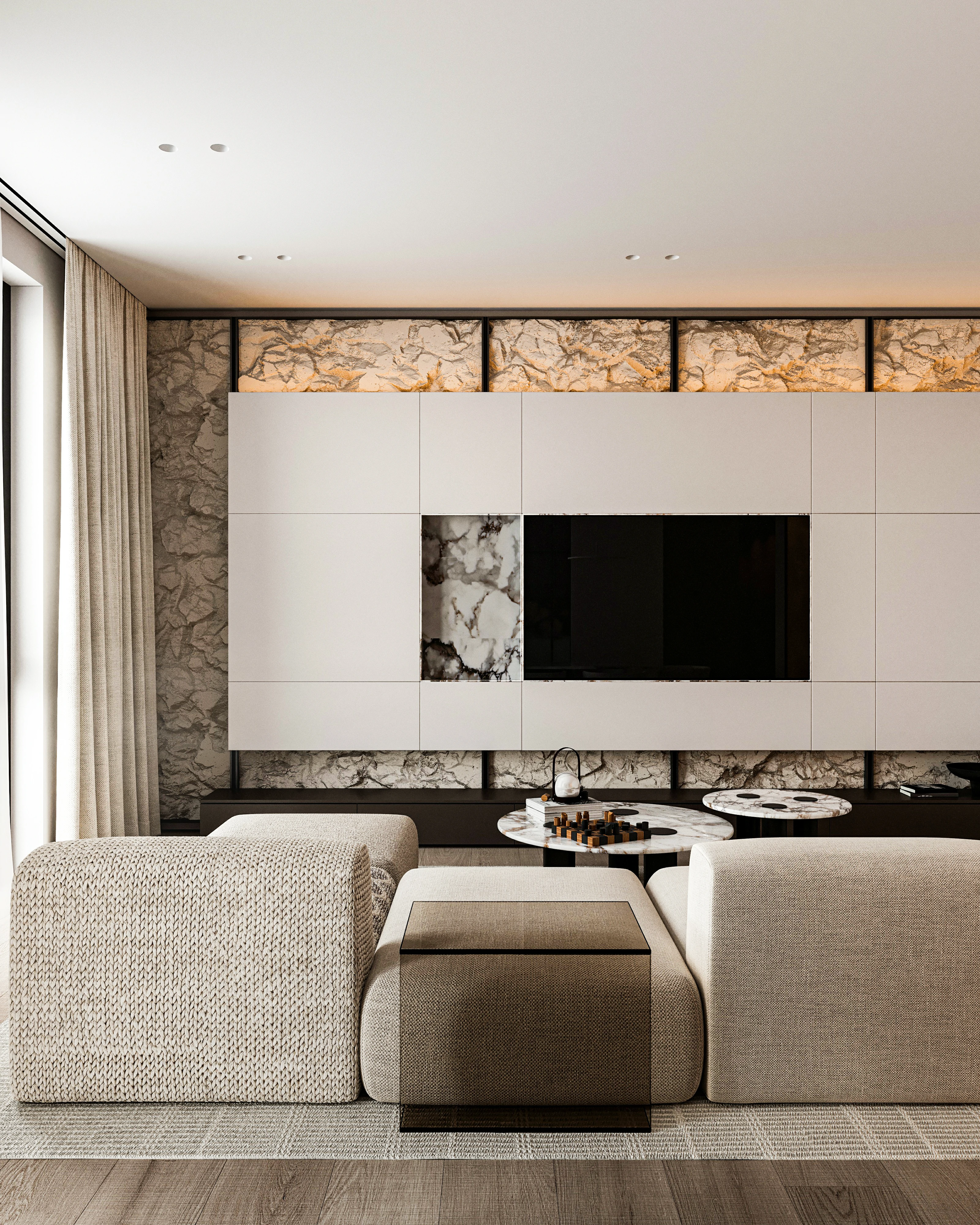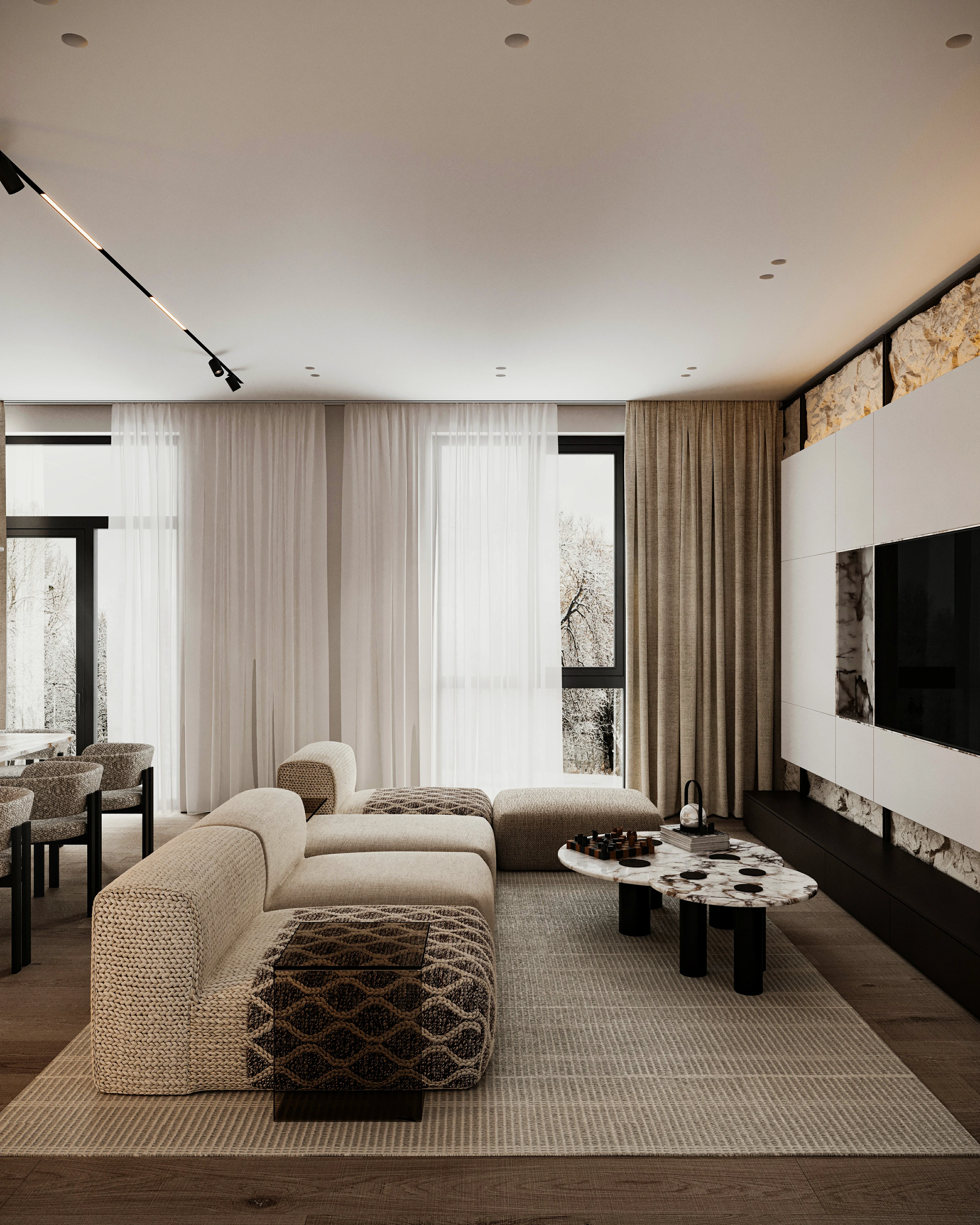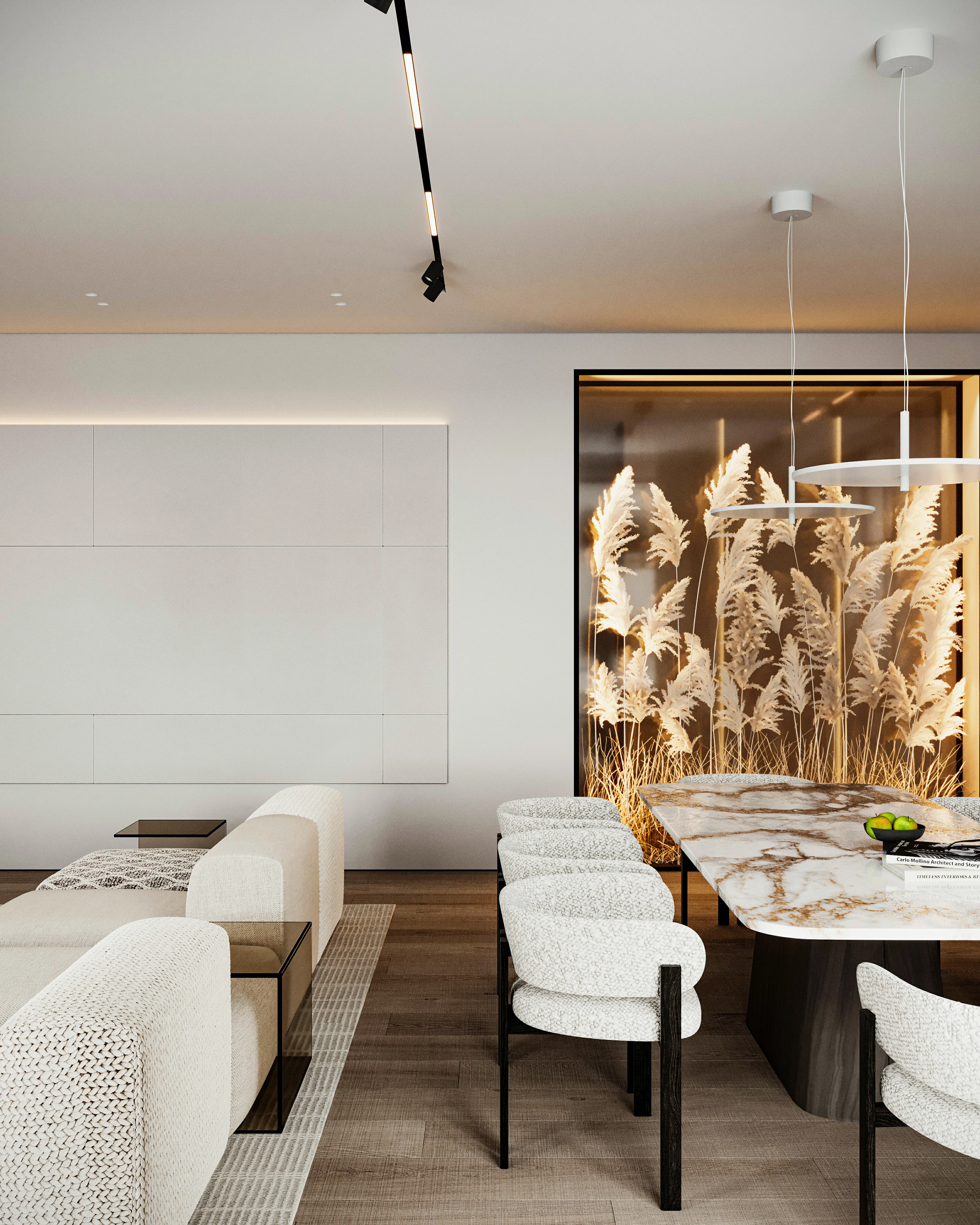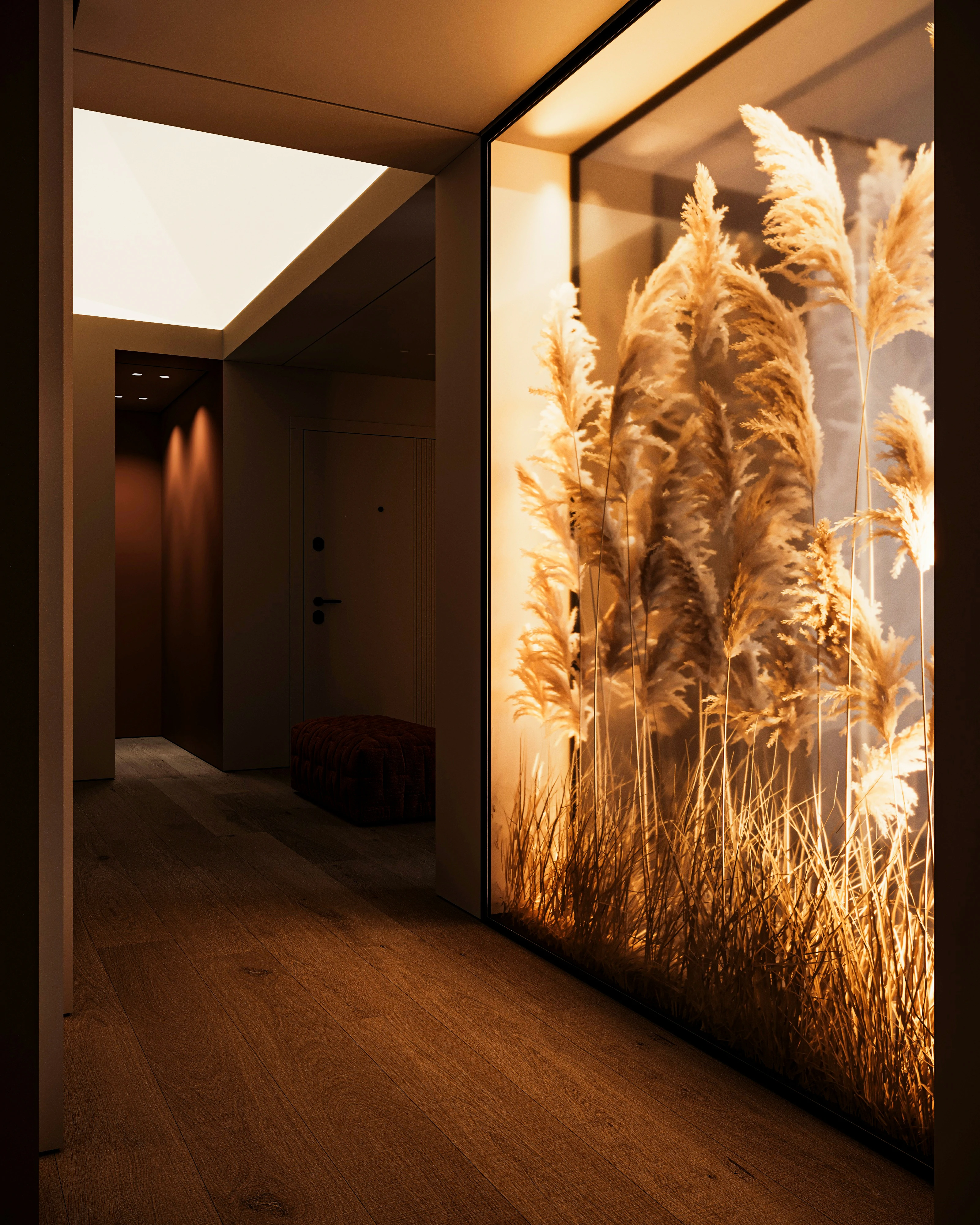 Пространство сочетает светлые базовые тона с насыщенным декором в теплых огненных оттенках бардо. В гостиной использованы элементы природной флоры — сухие ветки, декоративные растения — которые создают органичный акцент и добавляют текстуры интерьеру. Проект балансирует между современным стилем и уютной атмосферой, делая квартиру живой, теплой и выразительной.