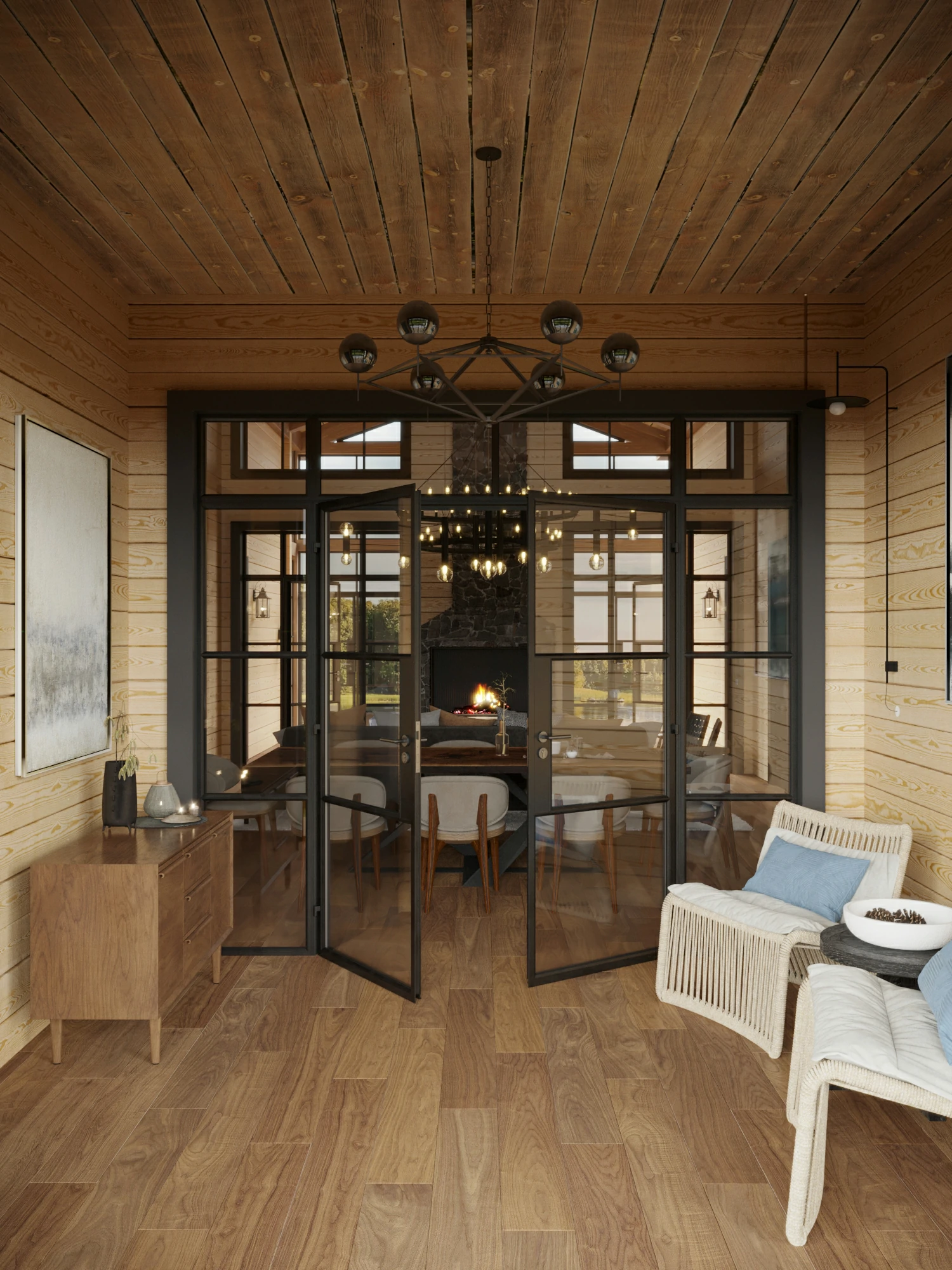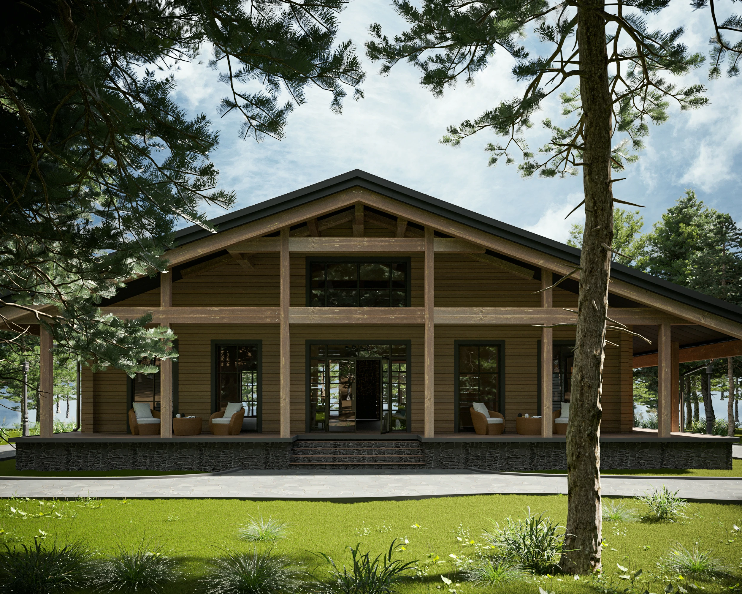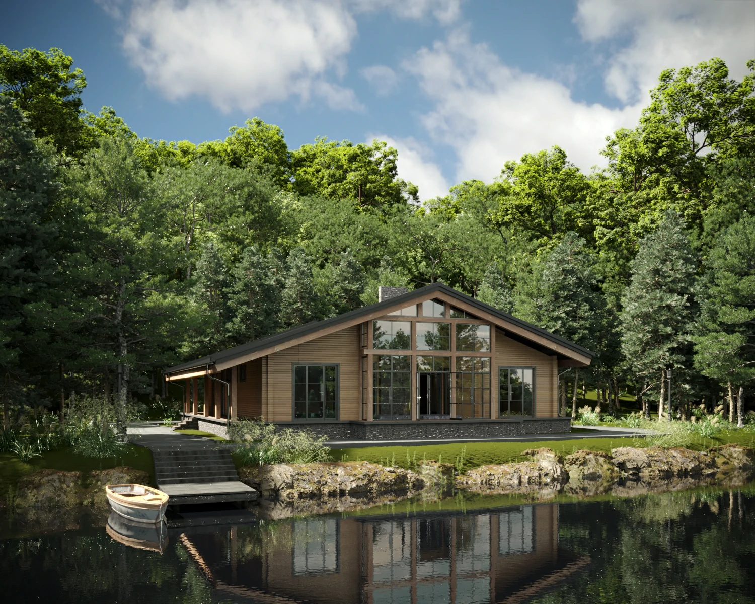 Одноэтажный дом с панорамным остеклением, расположенный на берегу озера. Натуральные материалы, простая геометрия и открытые виды создают атмосферу уединения и гармонии с природой. Просторная терраса и большие окна объединяют внутреннее пространство с окружающим ландшафтом.