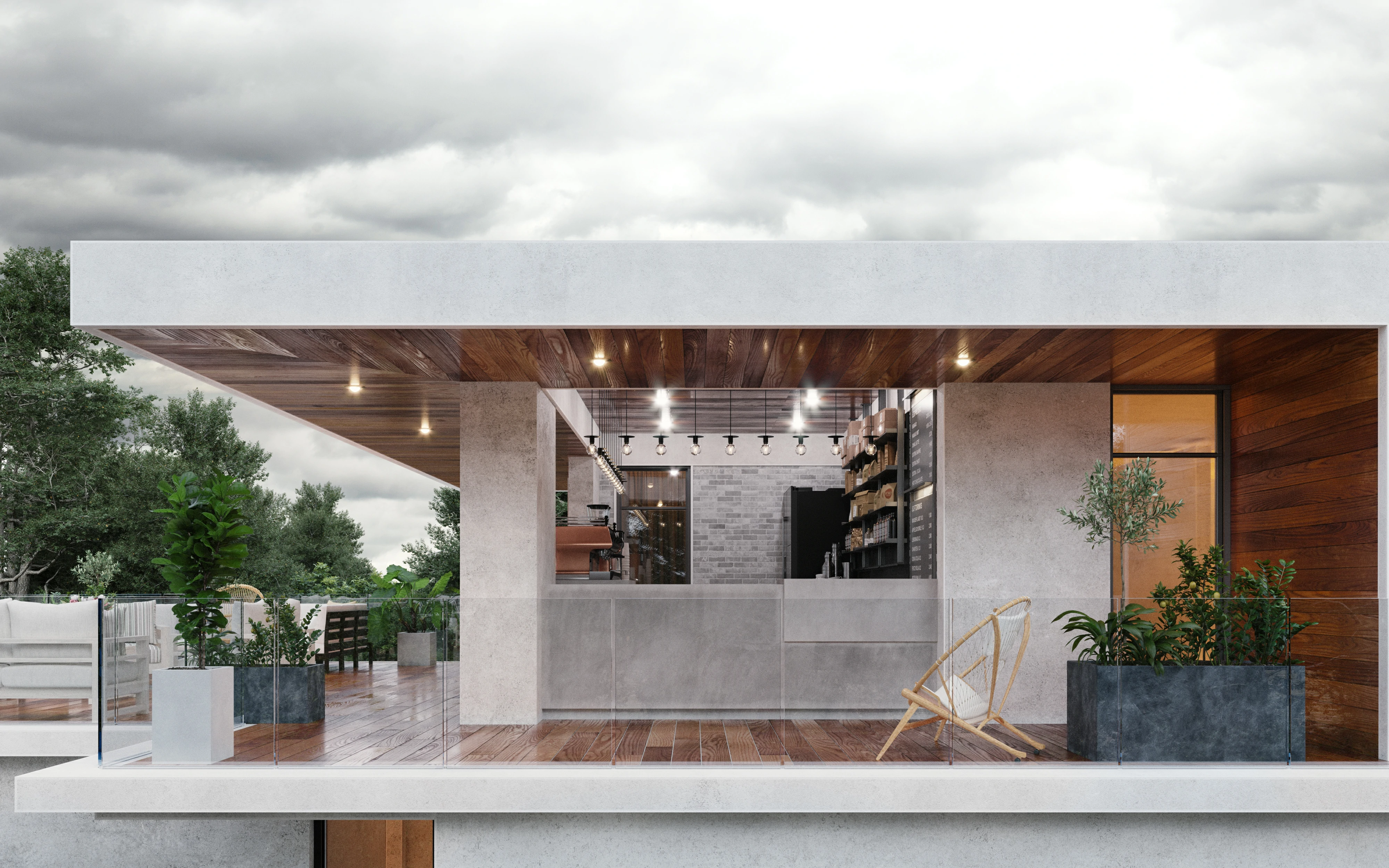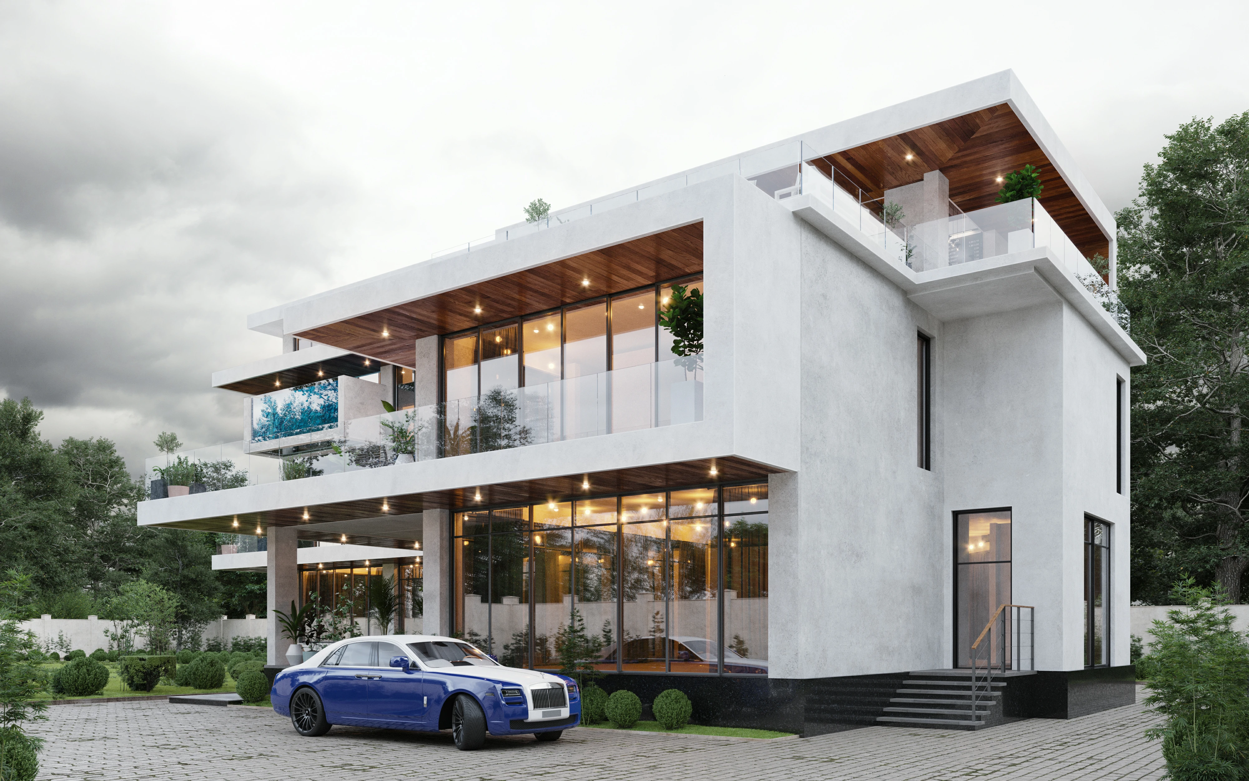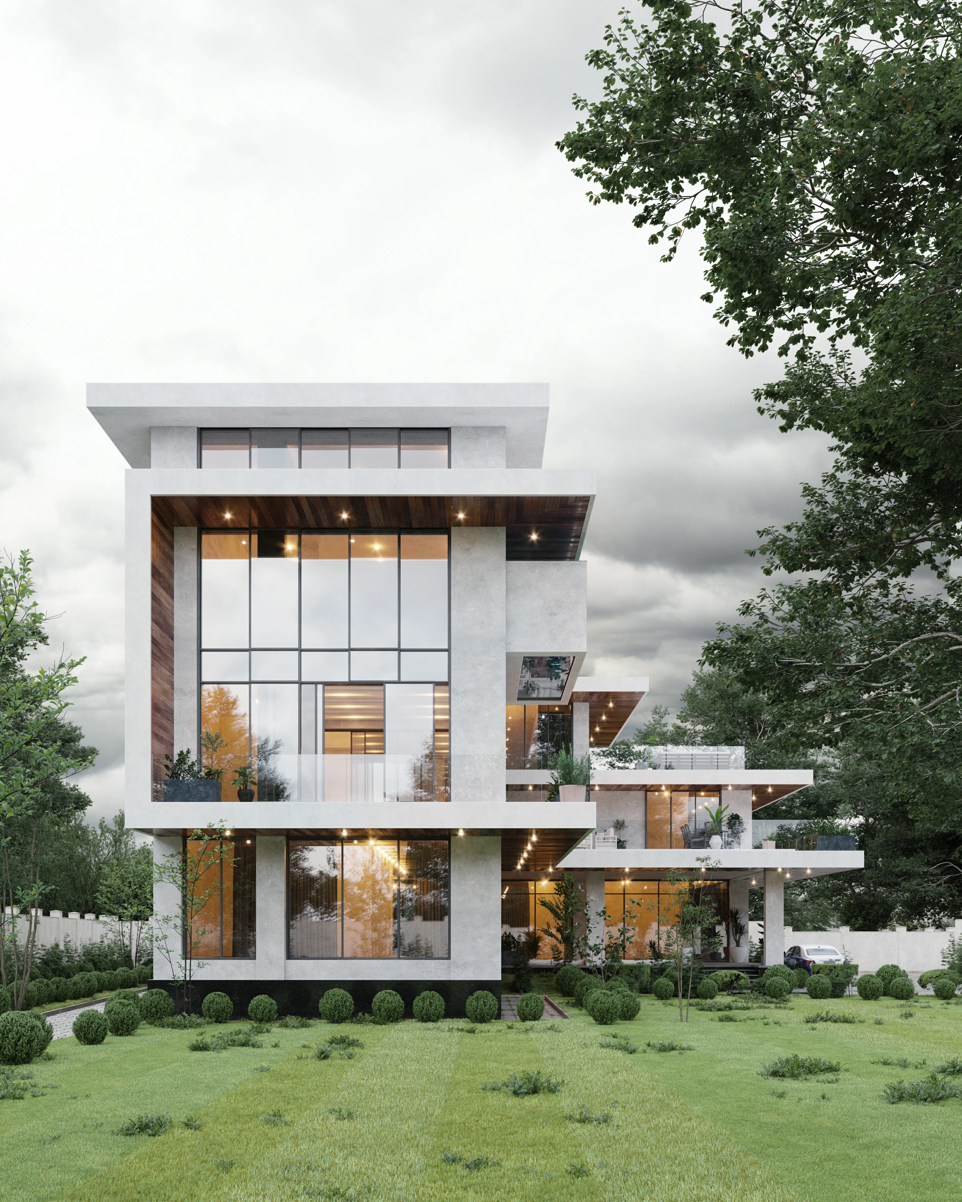 Это манифест динамичной современной архитектуры. Многослойные объёмы, обилие стекла и чёткая геометрия форм создают впечатление лёгкости и движения. Балконы, террасы и зелёные зоны интегрированы в структуру здания, формируя живое взаимодействие между интерьером и природой. Контраст холодного бетона и тёплого дерева придаёт дому характер и баланс. В вечернее время световая архитектура усиливает ощущение пространства и подчеркивает утончённость линий.