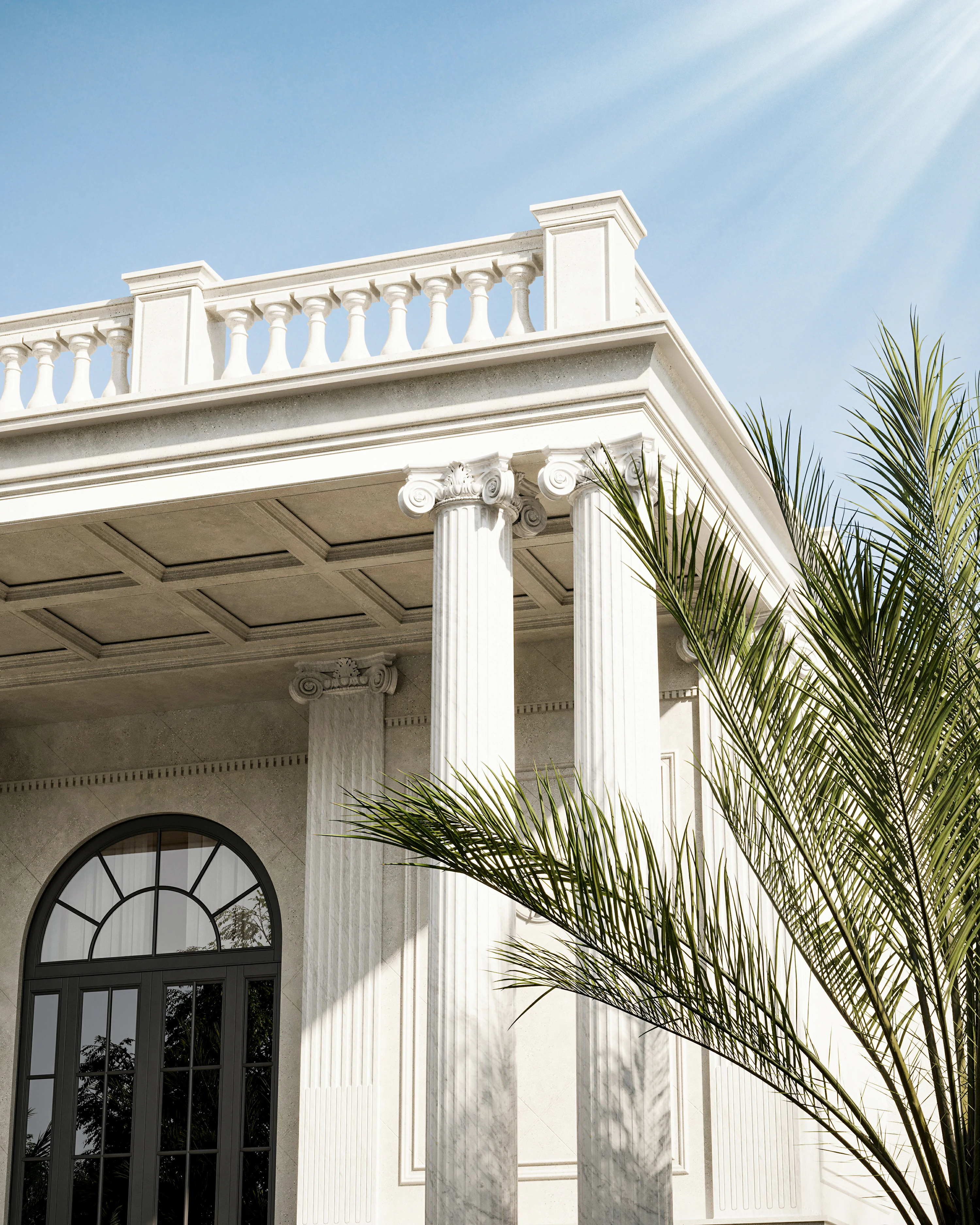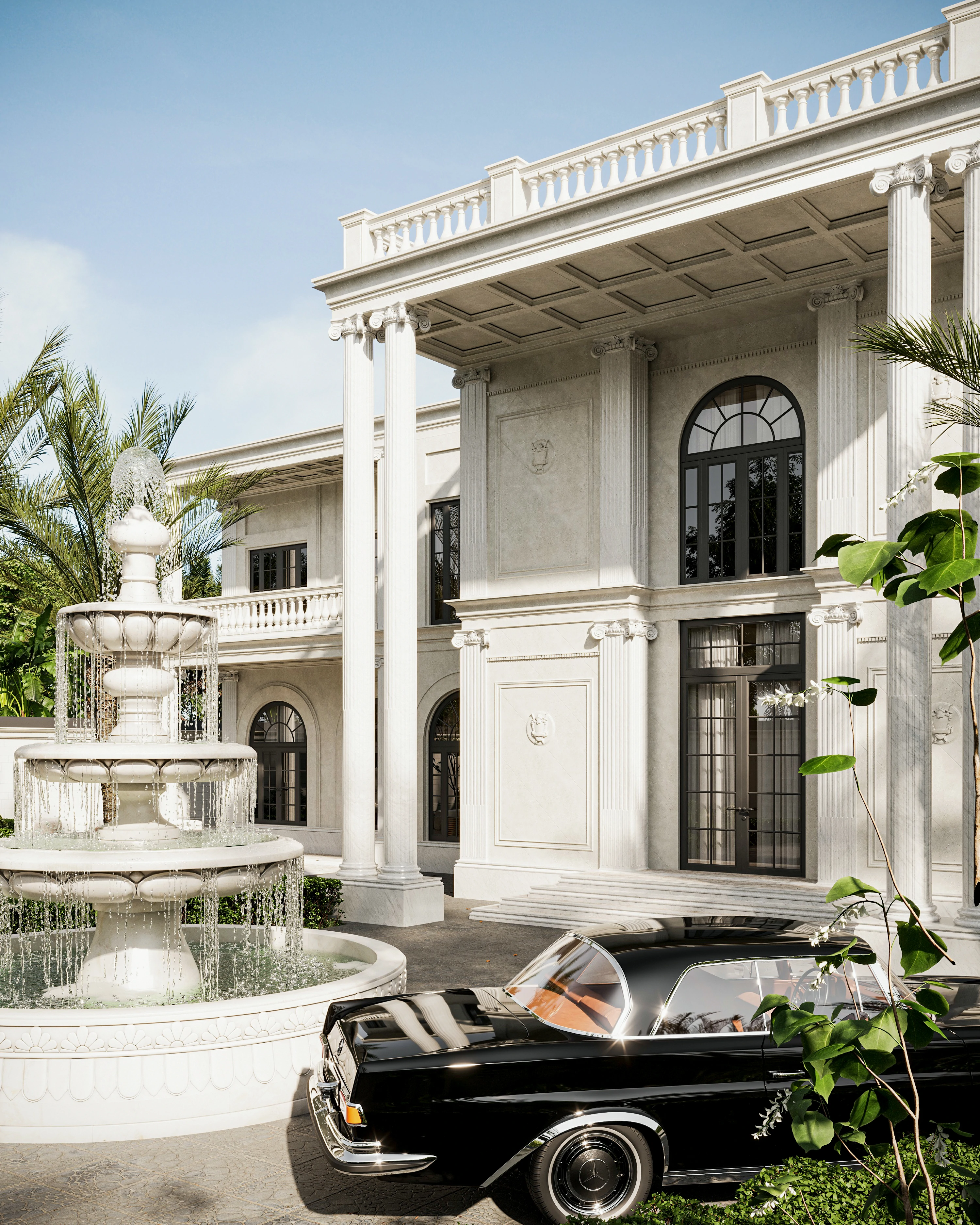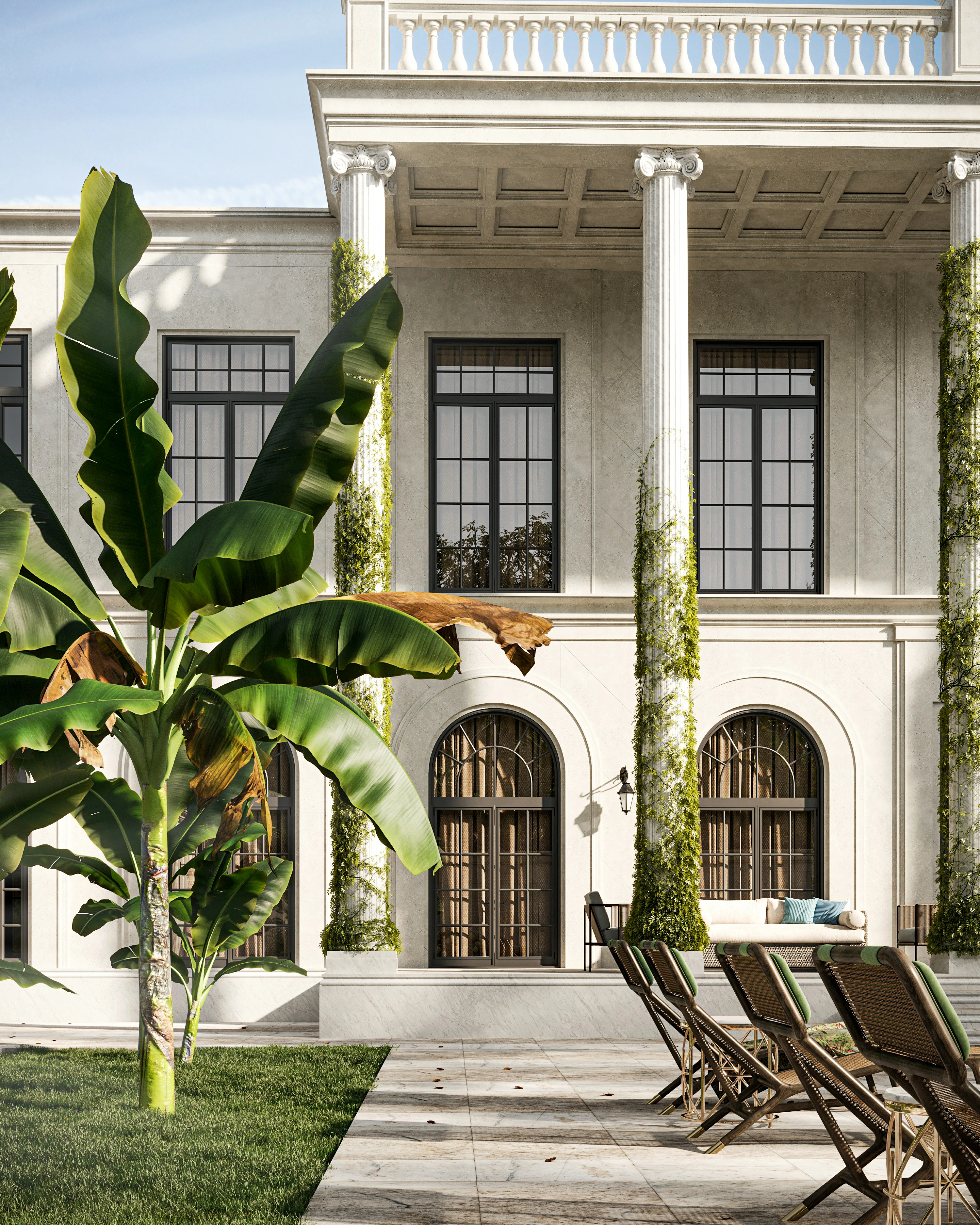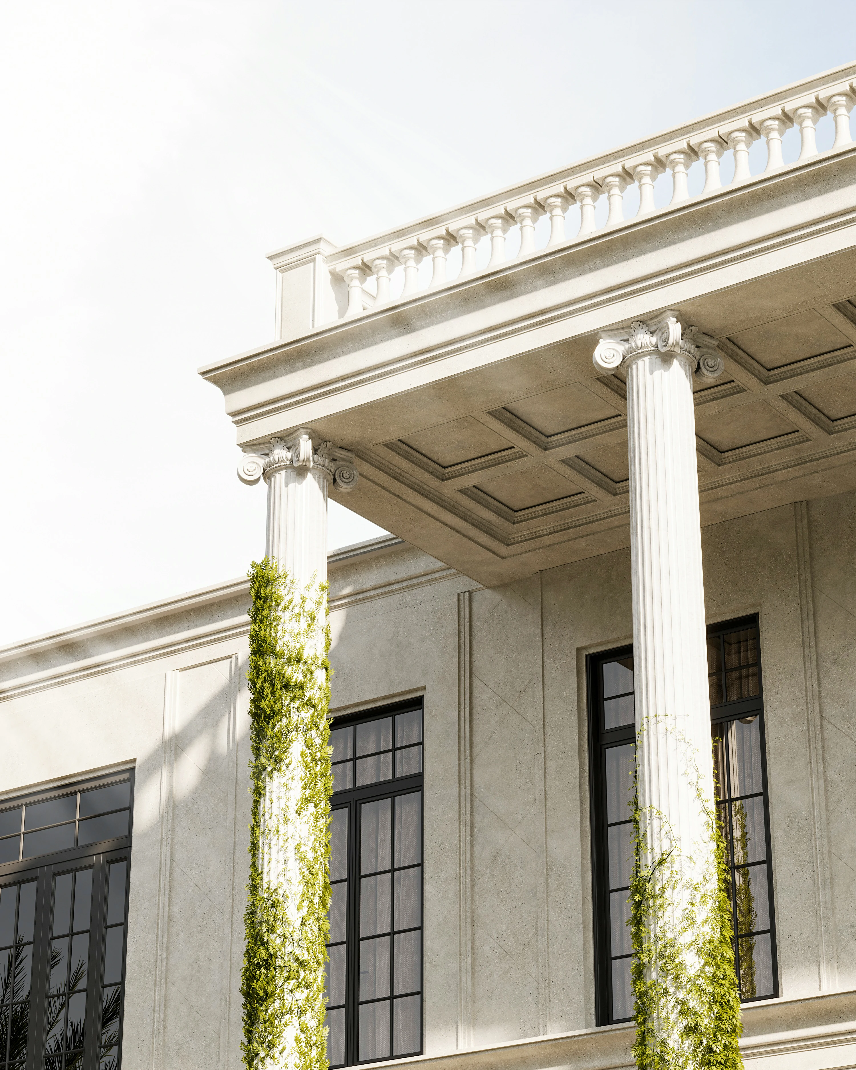 Воплощение изысканной роскоши и южного шарма. Архитектура дома вдохновлена классическими итальянскими виллами: величественные колонны, симметрия фасада, арочные окна и тёплая палитра создают атмосферу аристократической элегантности. Интерьер и экстерьер связаны через широкие террасы и выход к бассейну, где отражается свет дневного солнца. Вертикальное озеленение придаёт фасаду мягкость и живость, а природные материалы подчеркивают утончённый вкус владельцев.