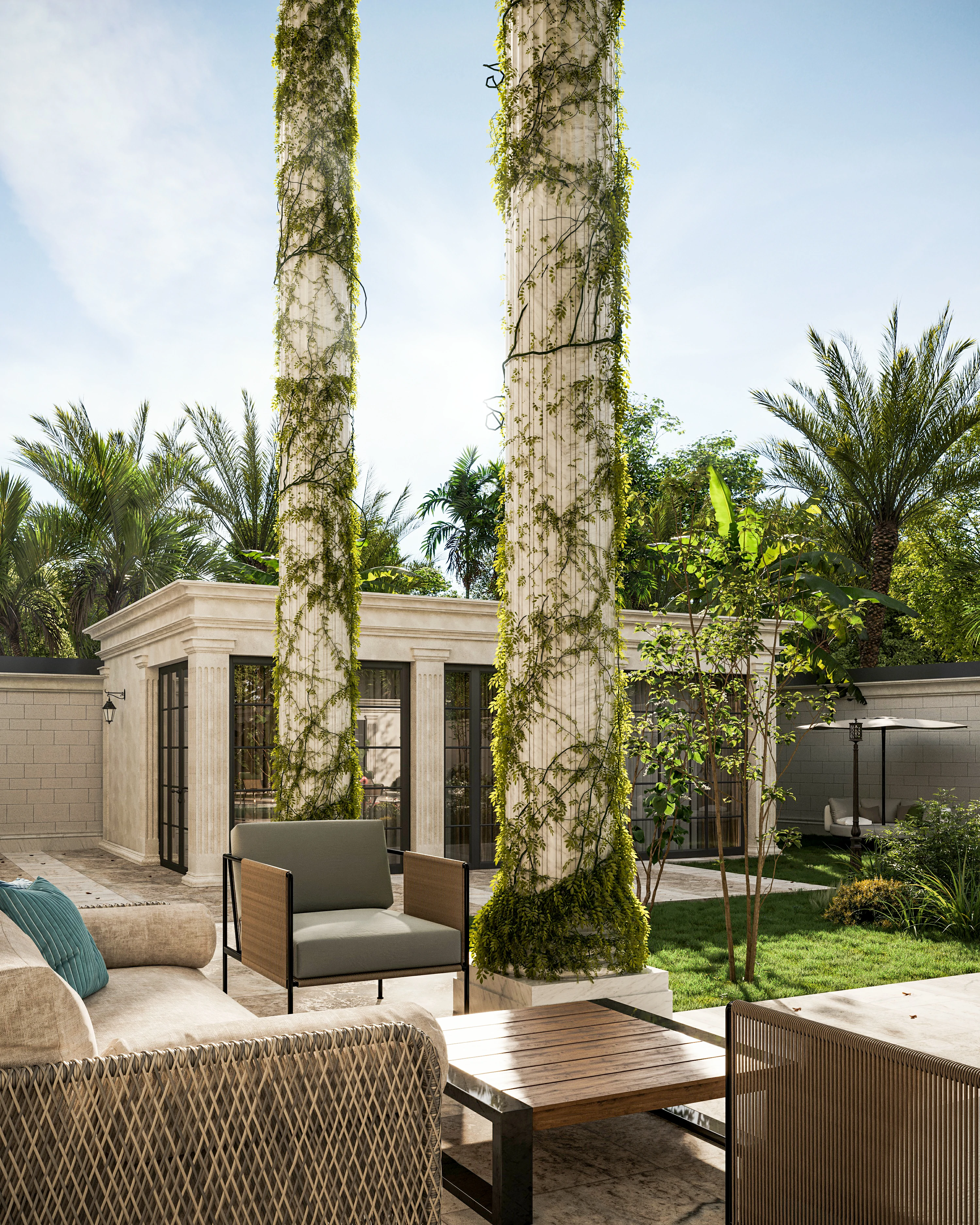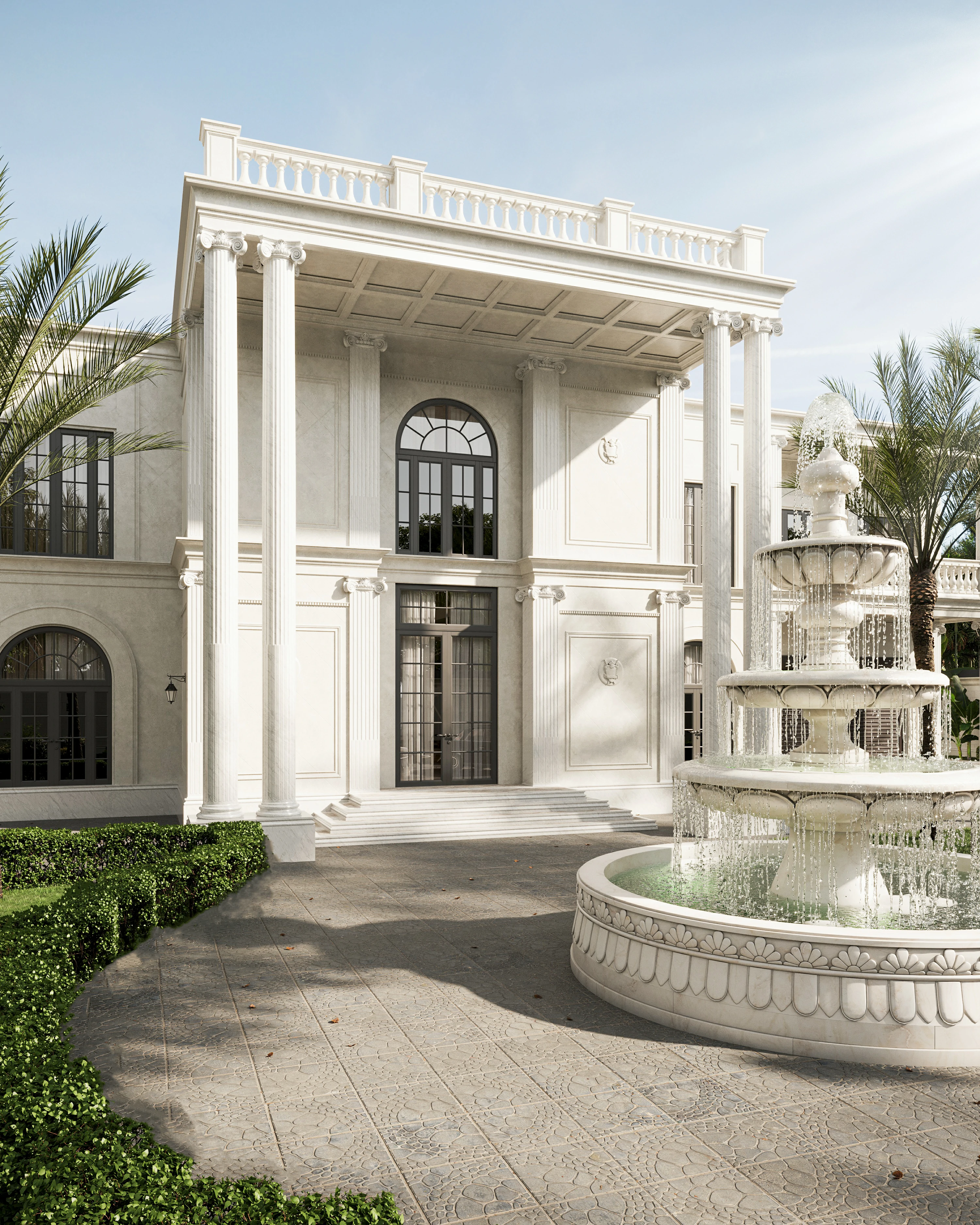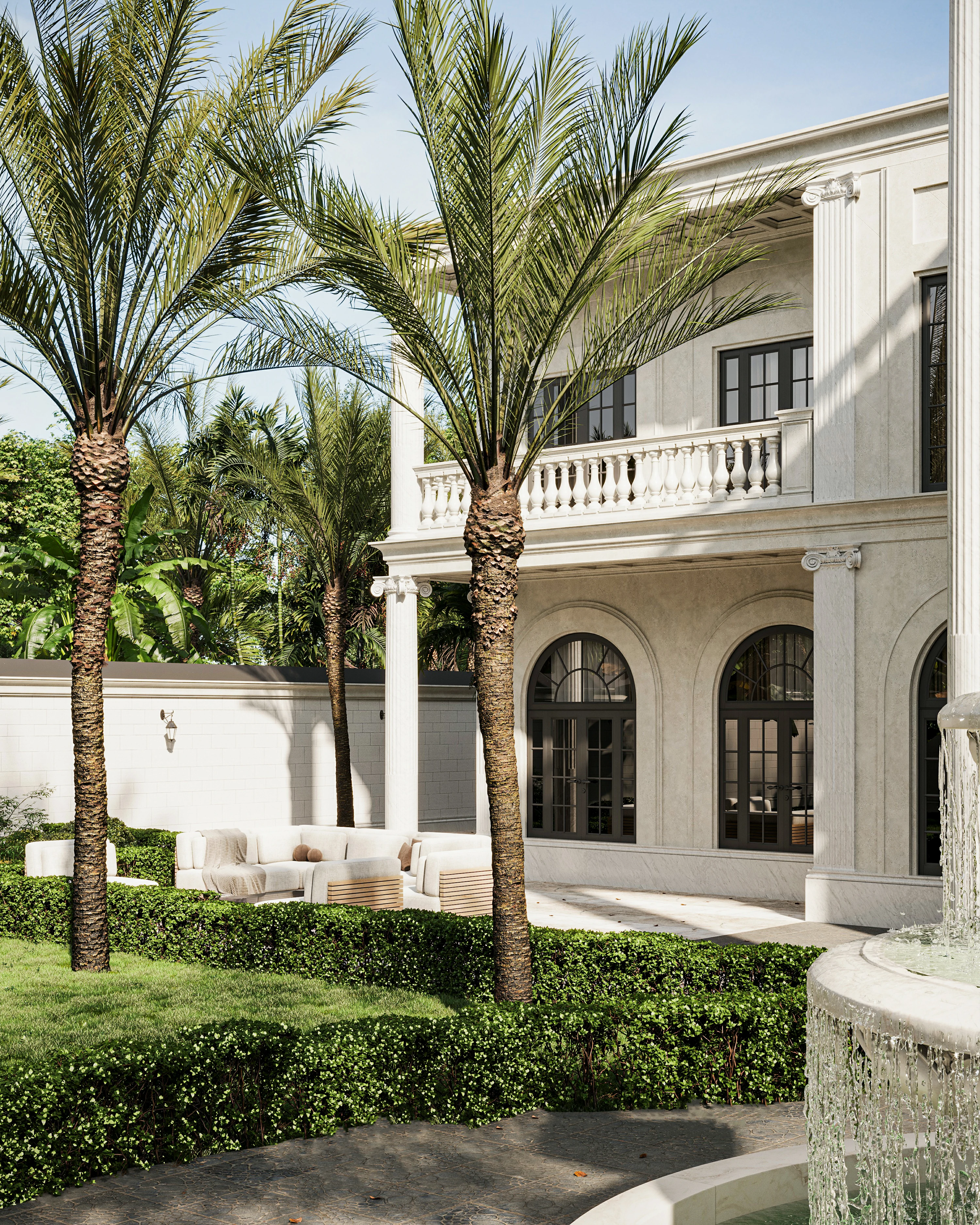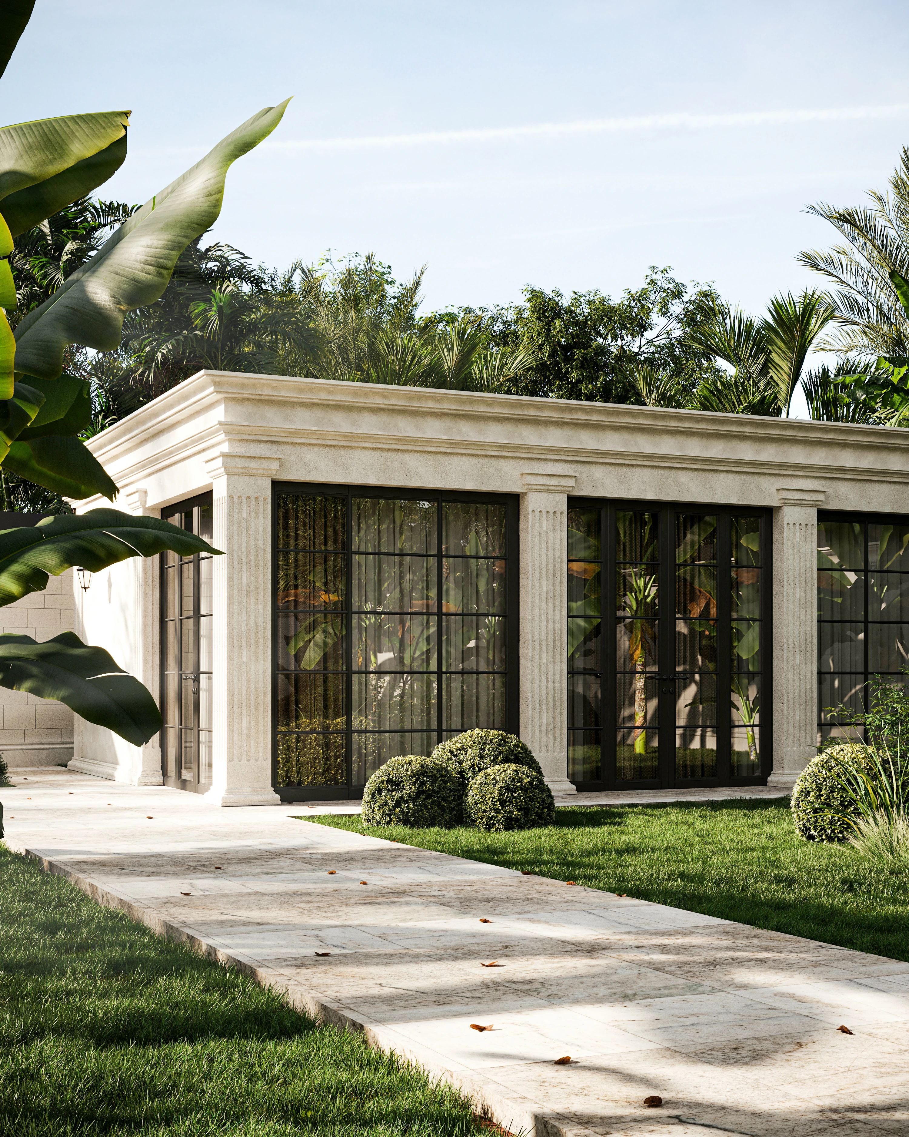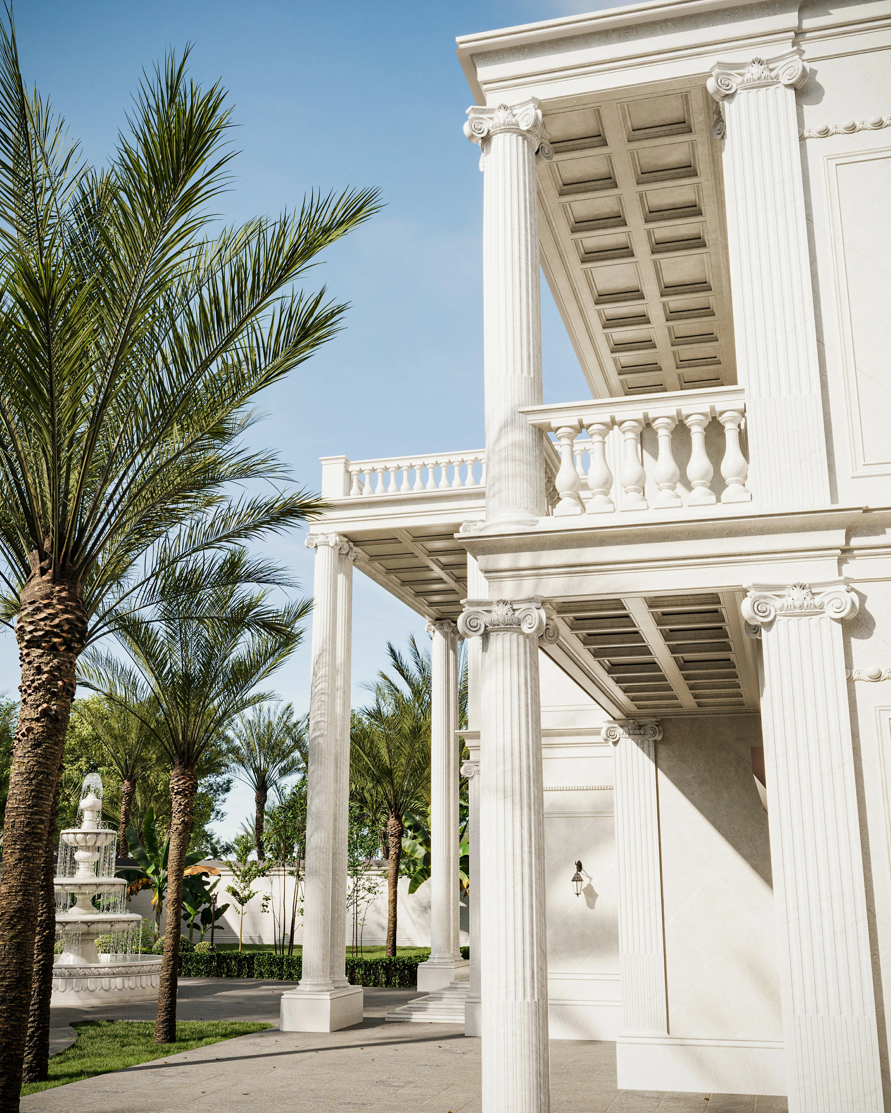 Воплощение изысканной роскоши и южного шарма. Архитектура дома вдохновлена классическими итальянскими виллами: величественные колонны, симметрия фасада, арочные окна и тёплая палитра создают атмосферу аристократической элегантности. Интерьер и экстерьер связаны через широкие террасы и выход к бассейну, где отражается свет дневного солнца. Вертикальное озеленение придаёт фасаду мягкость и живость, а природные материалы подчеркивают утончённый вкус владельцев.