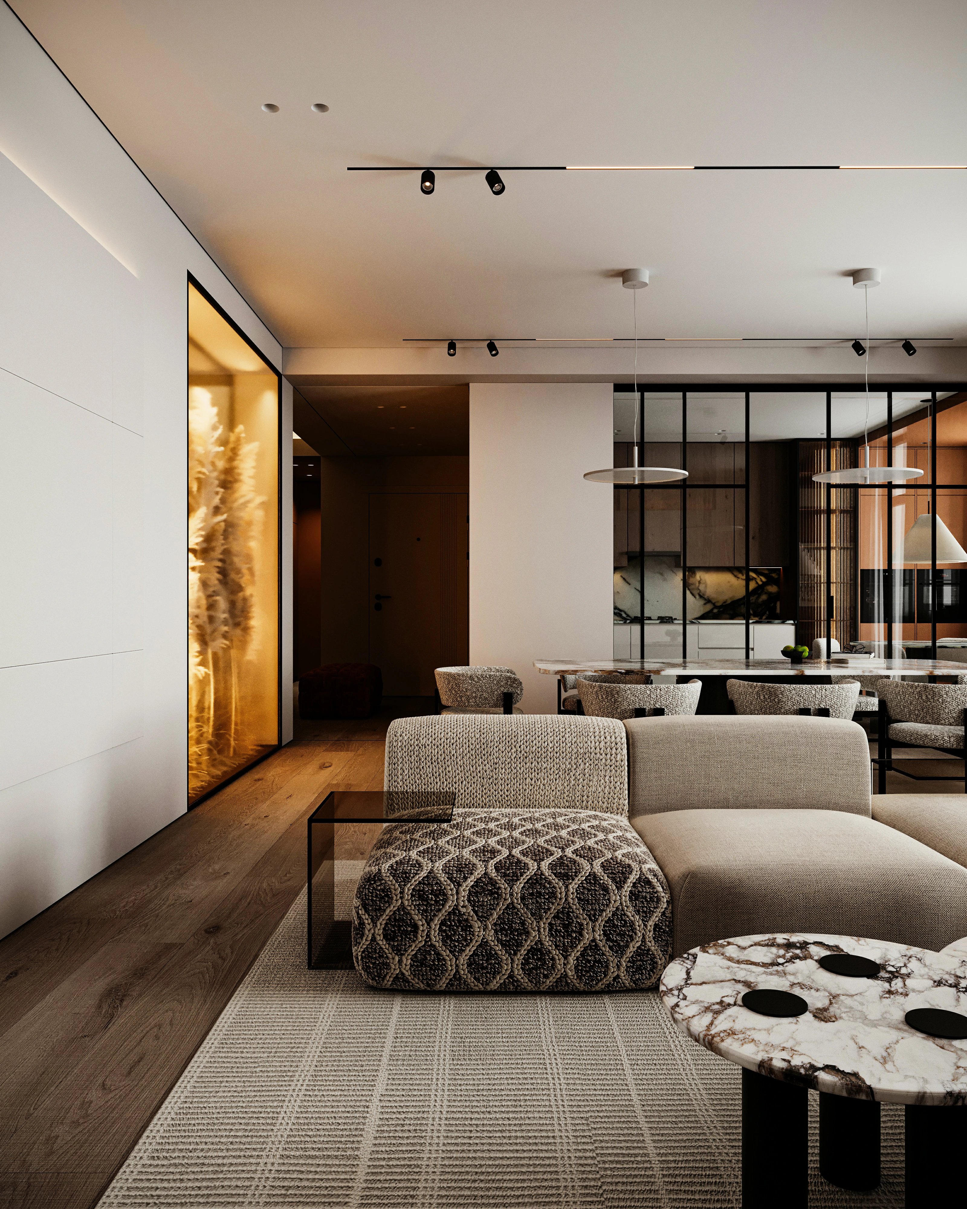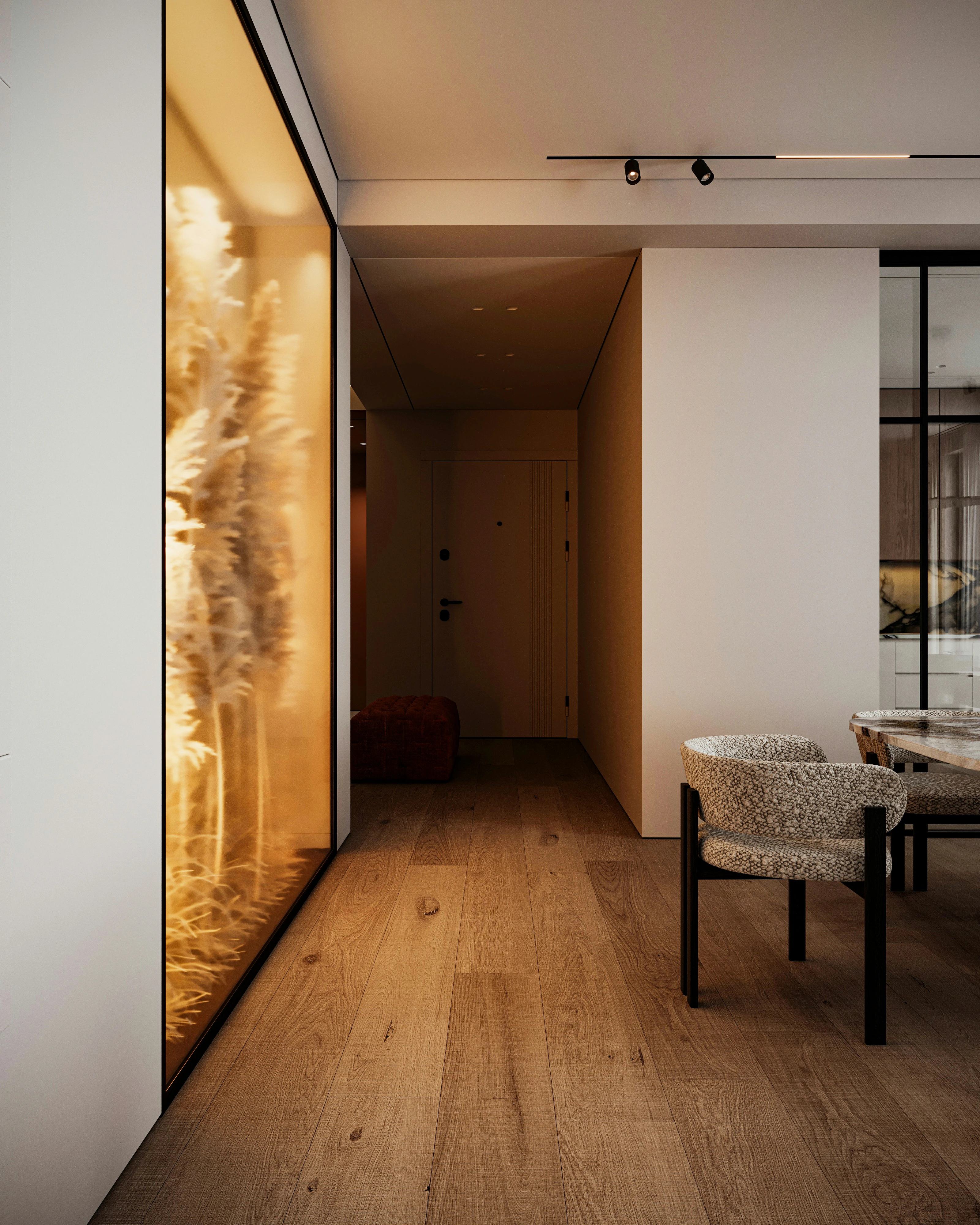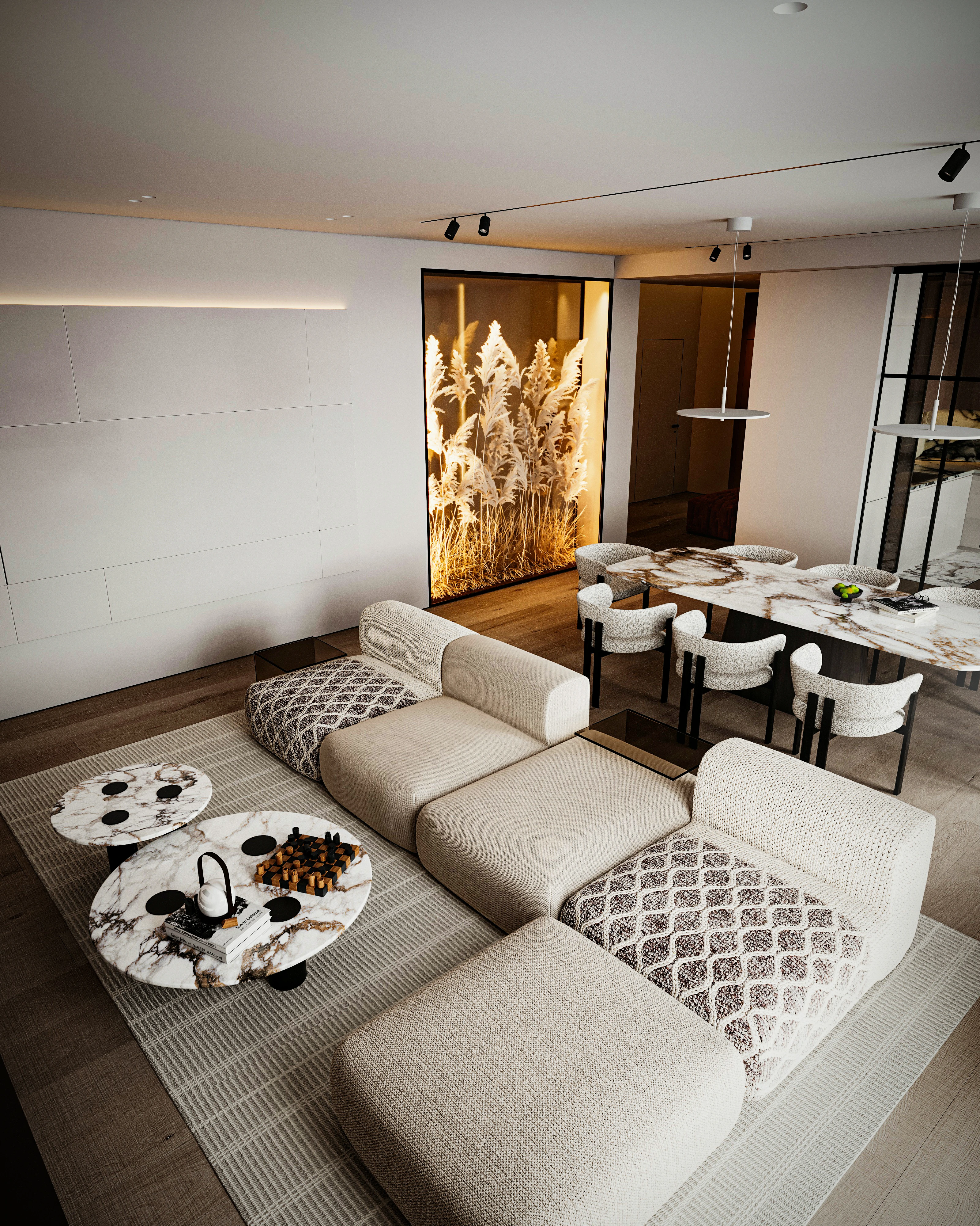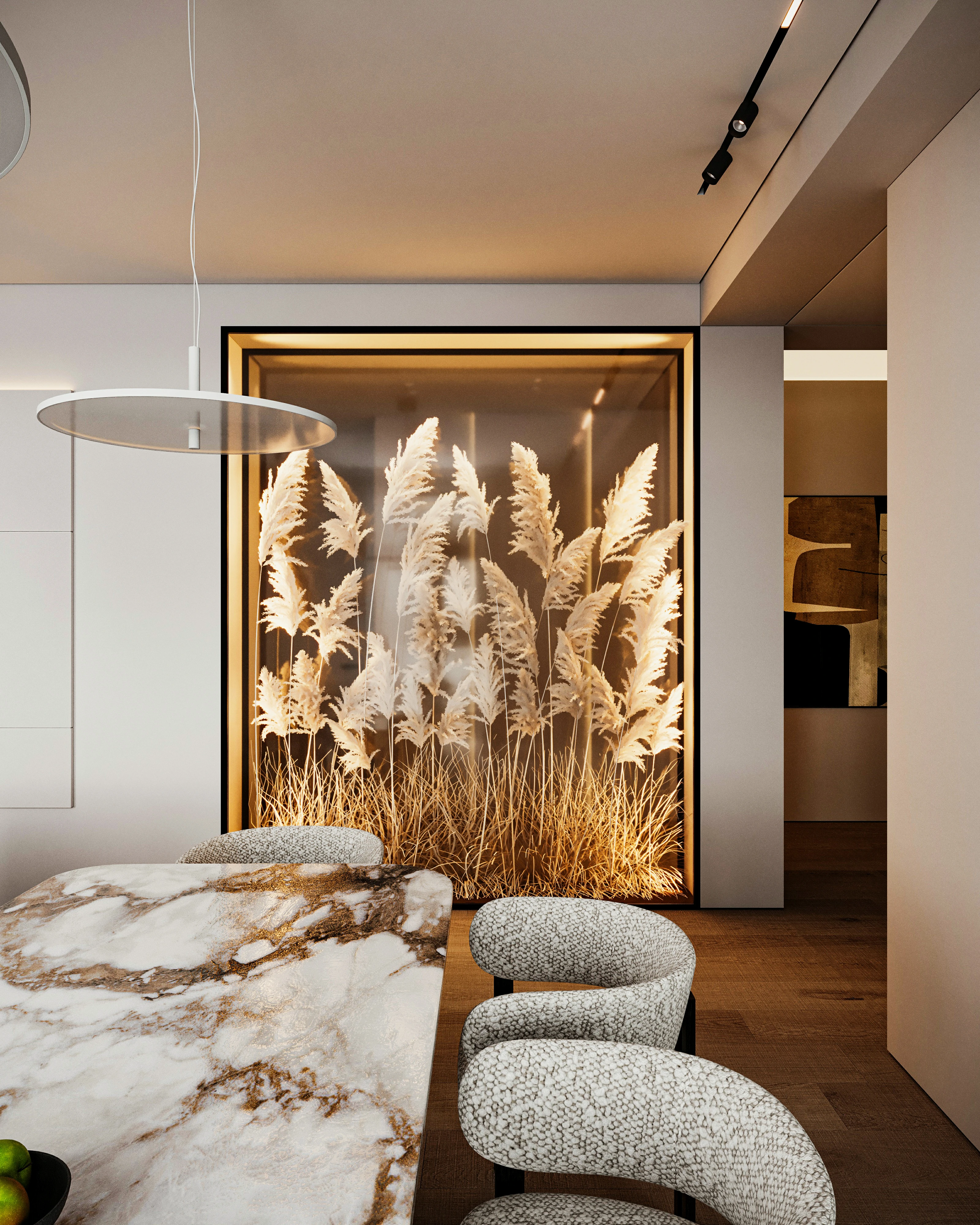 Пространство сочетает светлые базовые тона с насыщенным декором в теплых огненных оттенках бардо. В гостиной использованы элементы природной флоры — сухие ветки, декоративные растения — которые создают органичный акцент и добавляют текстуры интерьеру. Проект балансирует между современным стилем и уютной атмосферой, делая квартиру живой, теплой и выразительной.