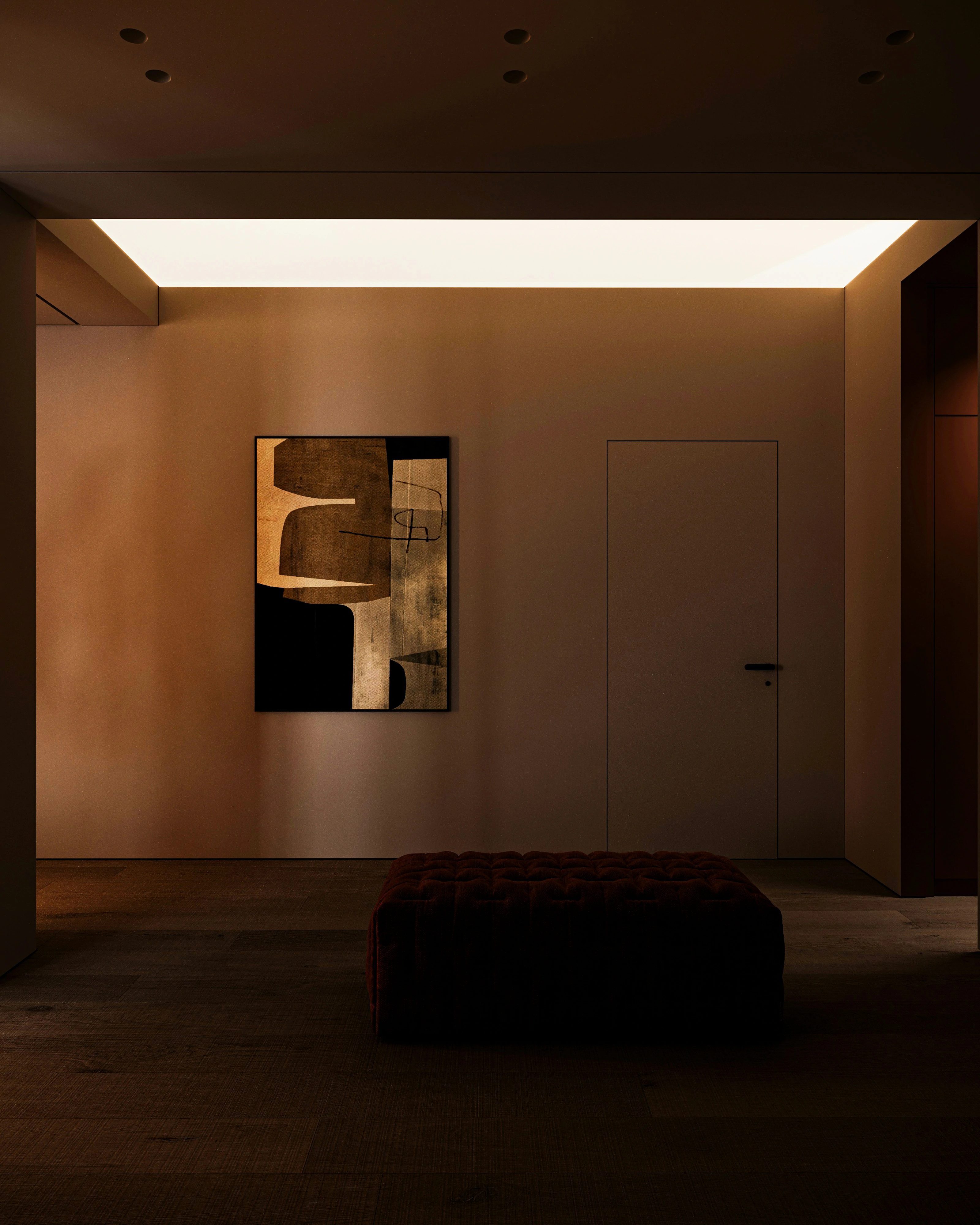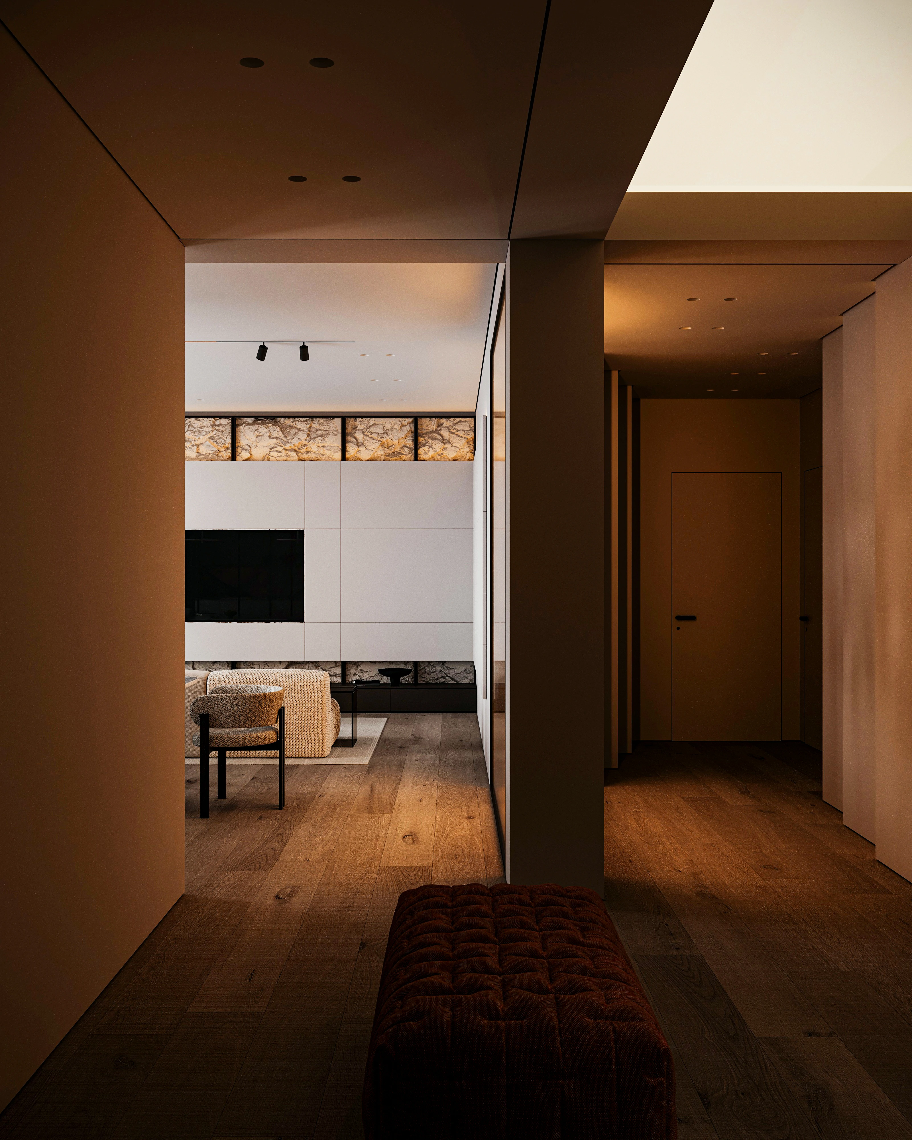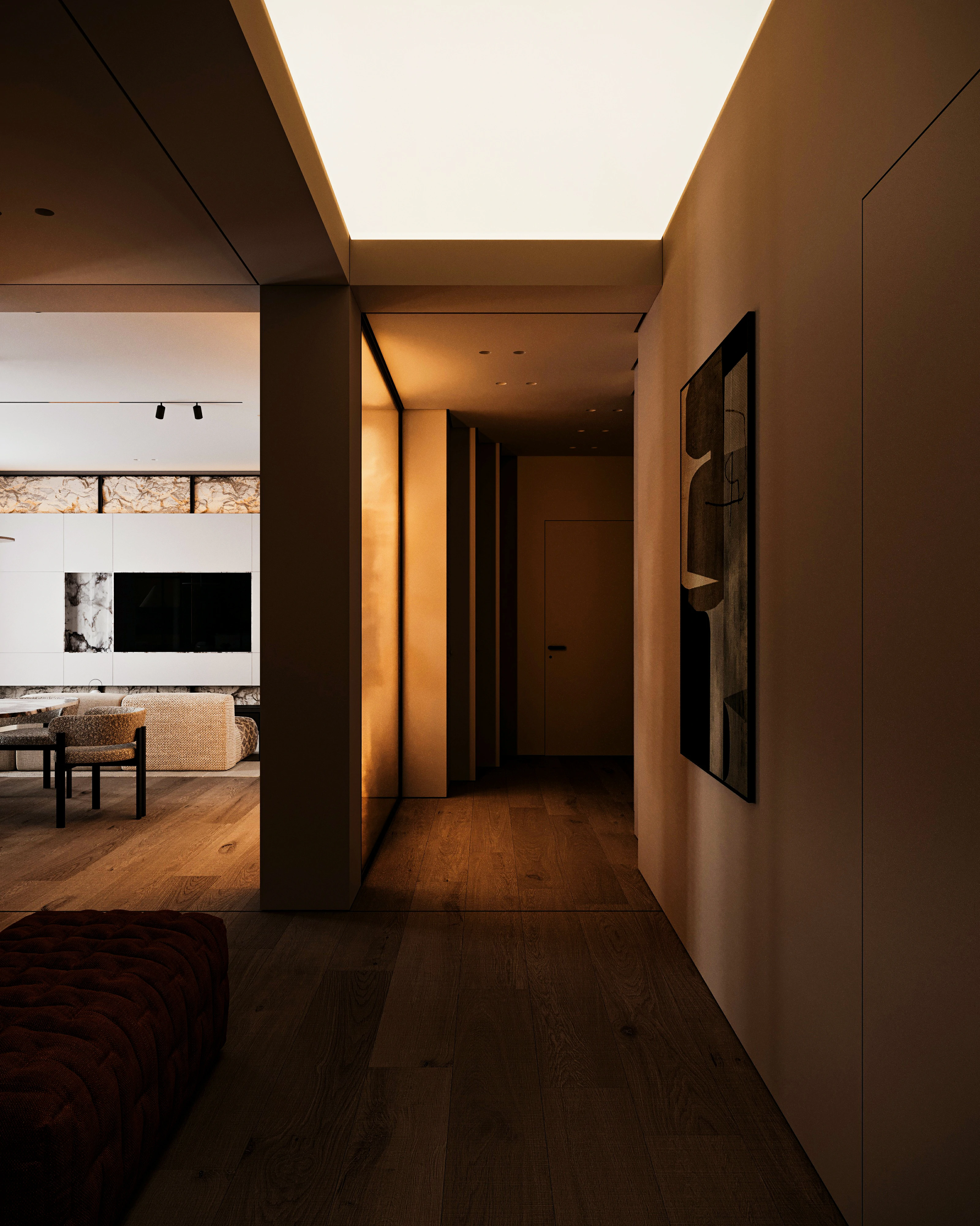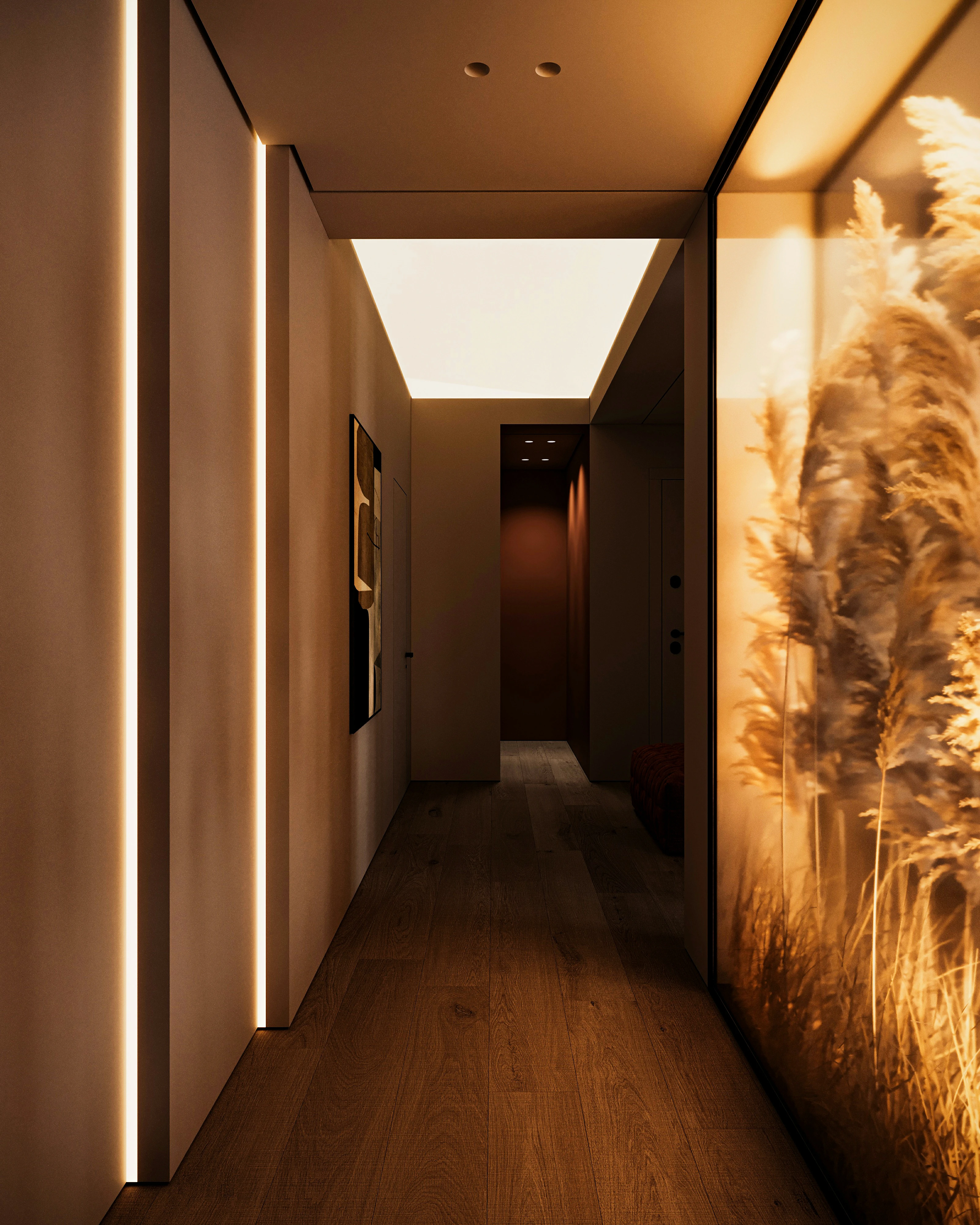 Пространство сочетает светлые базовые тона с насыщенным декором в теплых огненных оттенках бардо. В гостиной использованы элементы природной флоры — сухие ветки, декоративные растения — которые создают органичный акцент и добавляют текстуры интерьеру. Проект балансирует между современным стилем и уютной атмосферой, делая квартиру живой, теплой и выразительной.