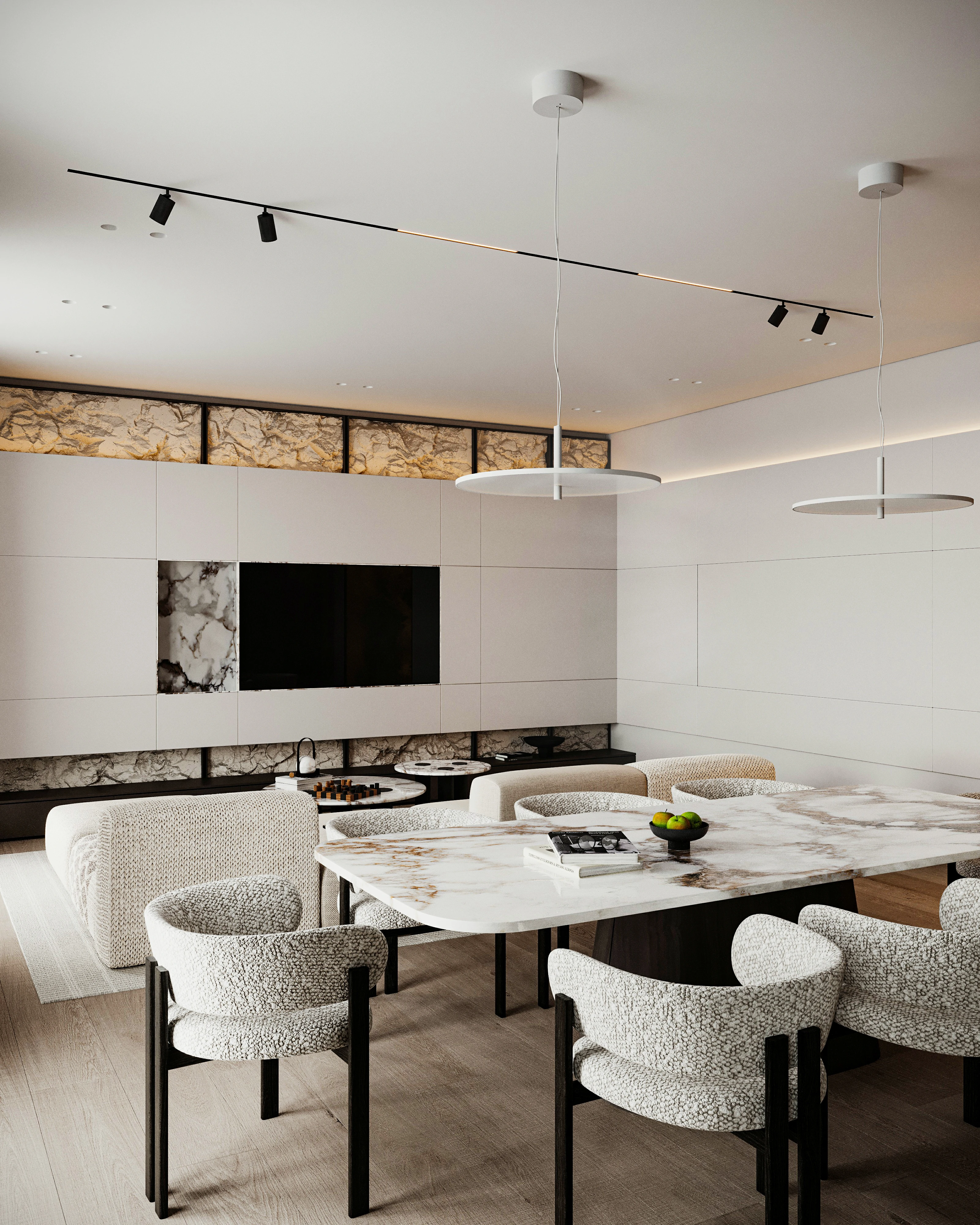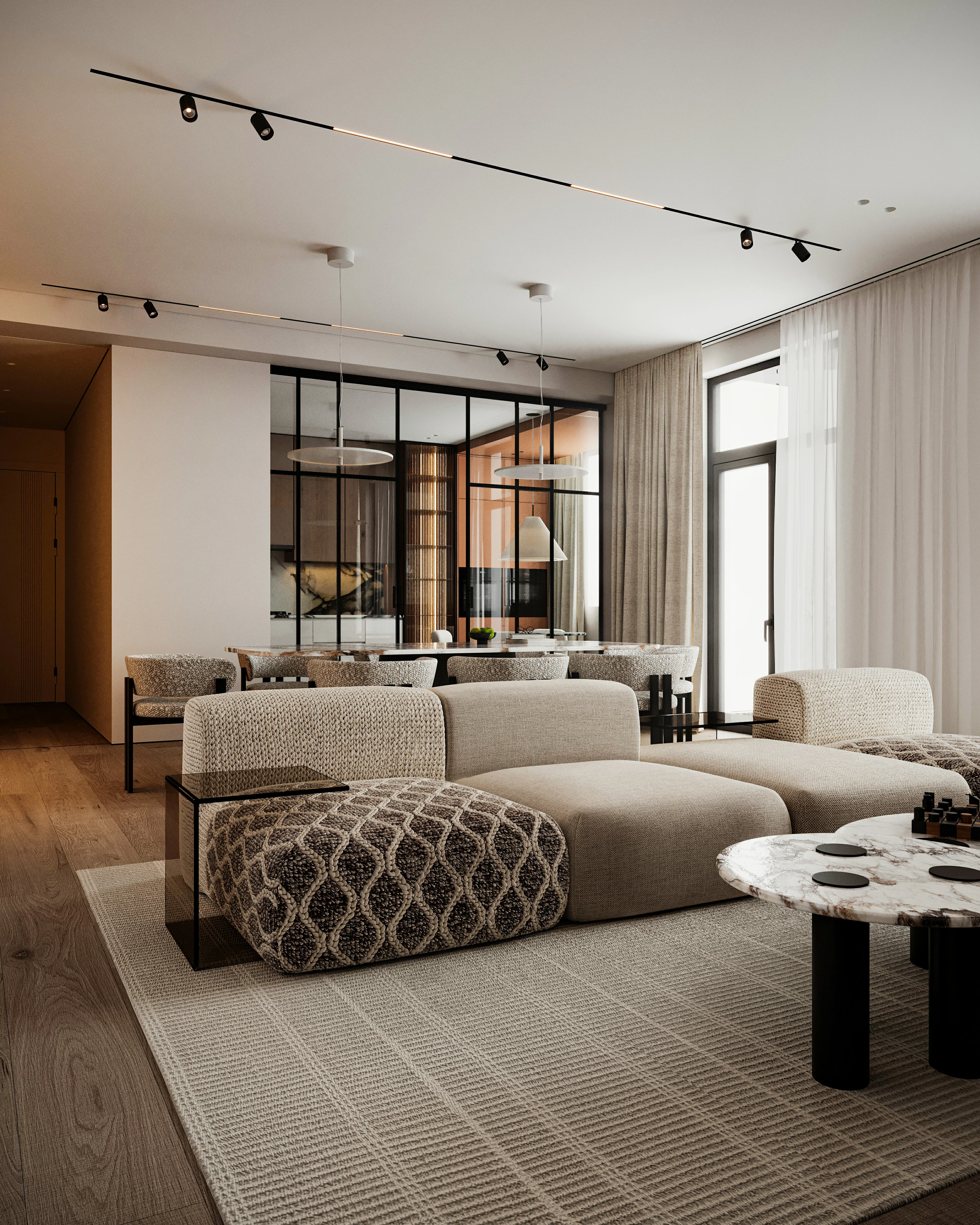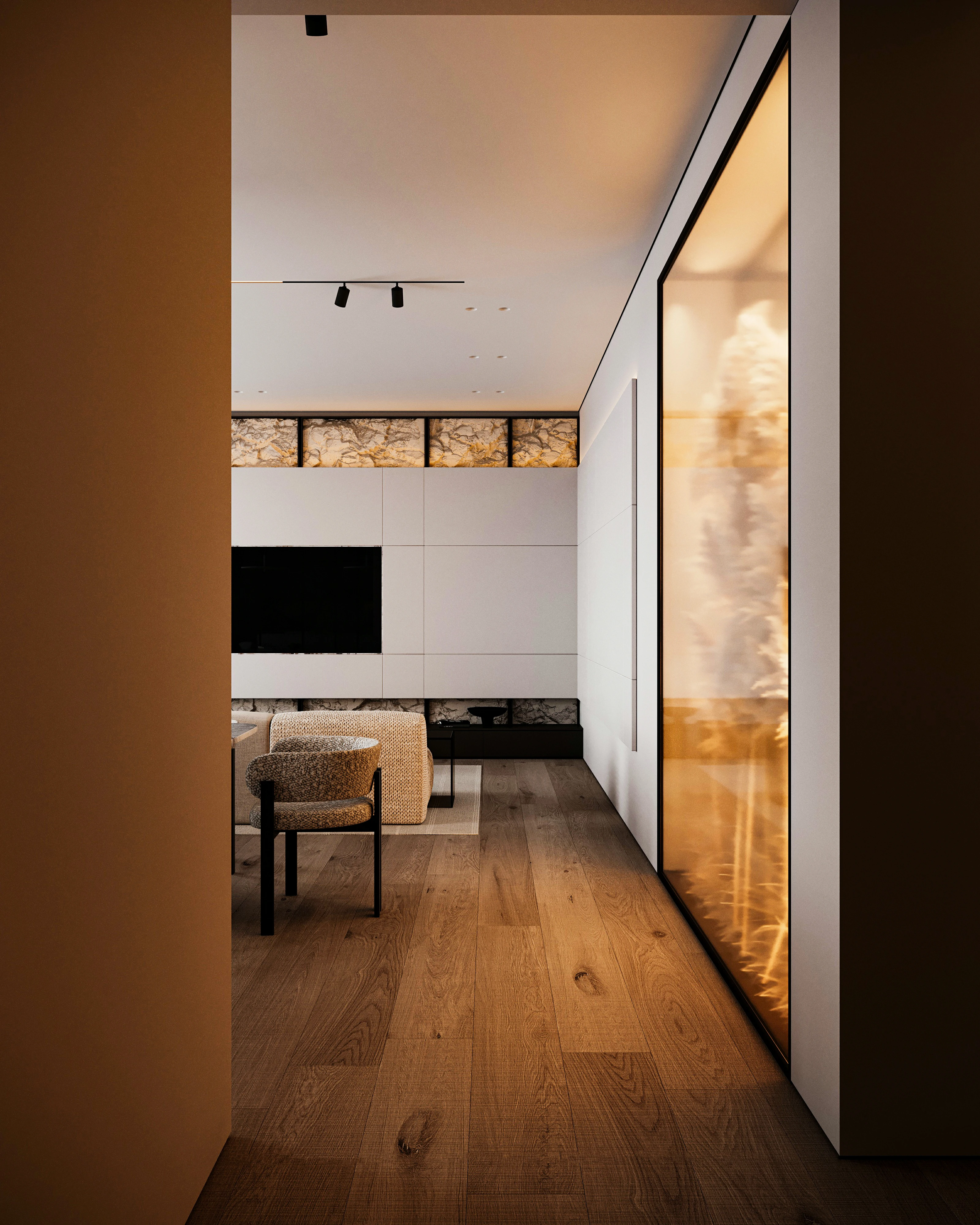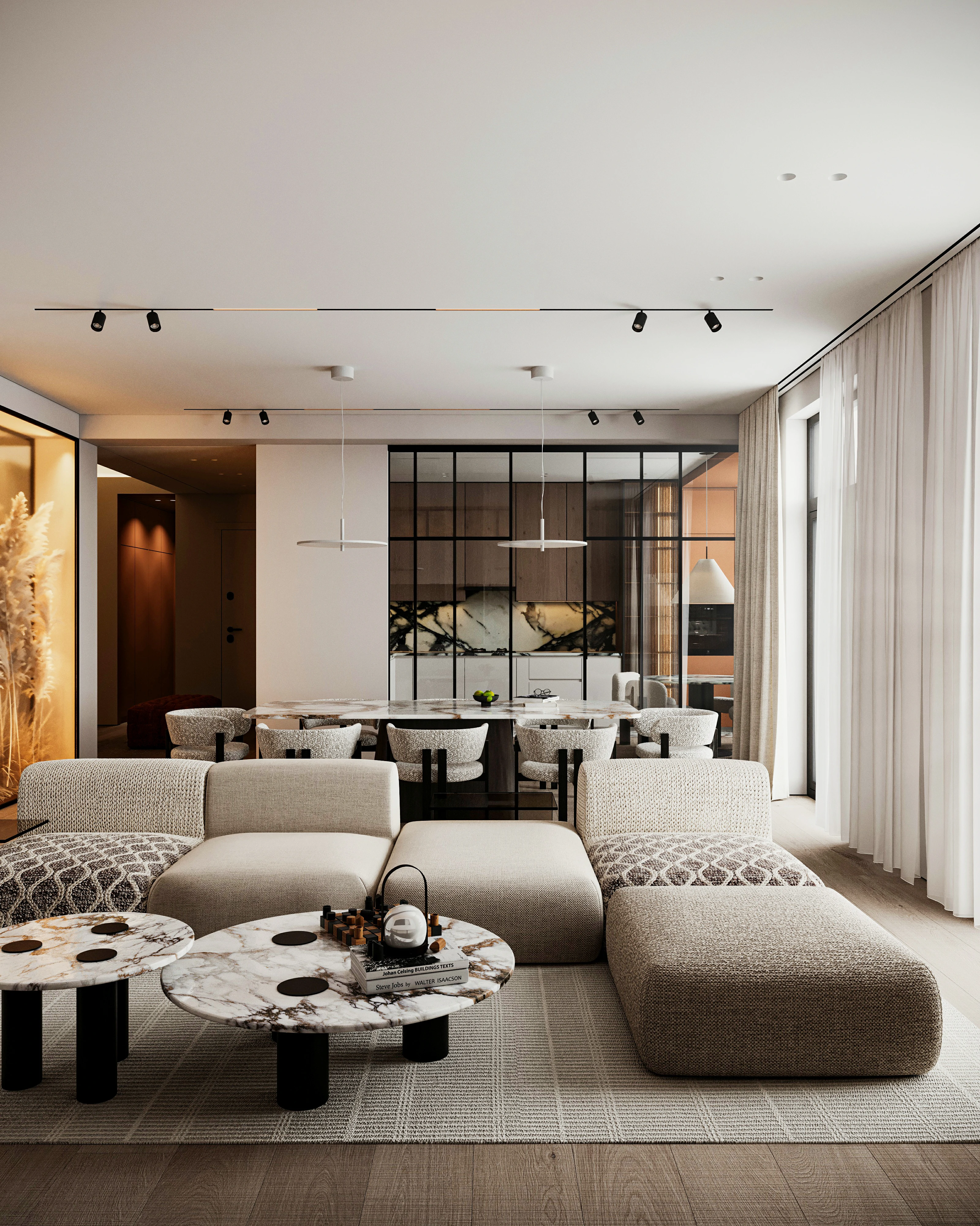 Пространство сочетает светлые базовые тона с насыщенным декором в теплых огненных оттенках бардо. В гостиной использованы элементы природной флоры — сухие ветки, декоративные растения — которые создают органичный акцент и добавляют текстуры интерьеру. Проект балансирует между современным стилем и уютной атмосферой, делая квартиру живой, теплой и выразительной.